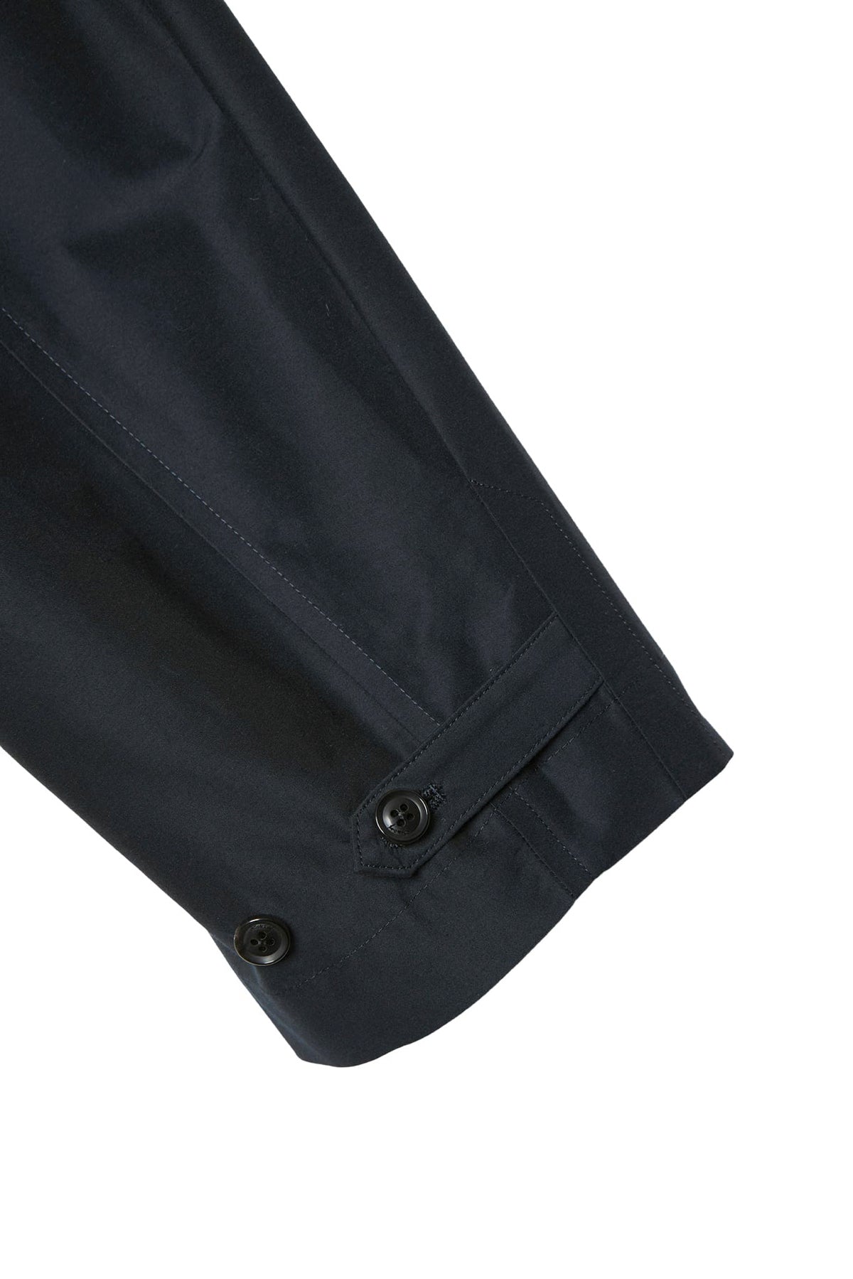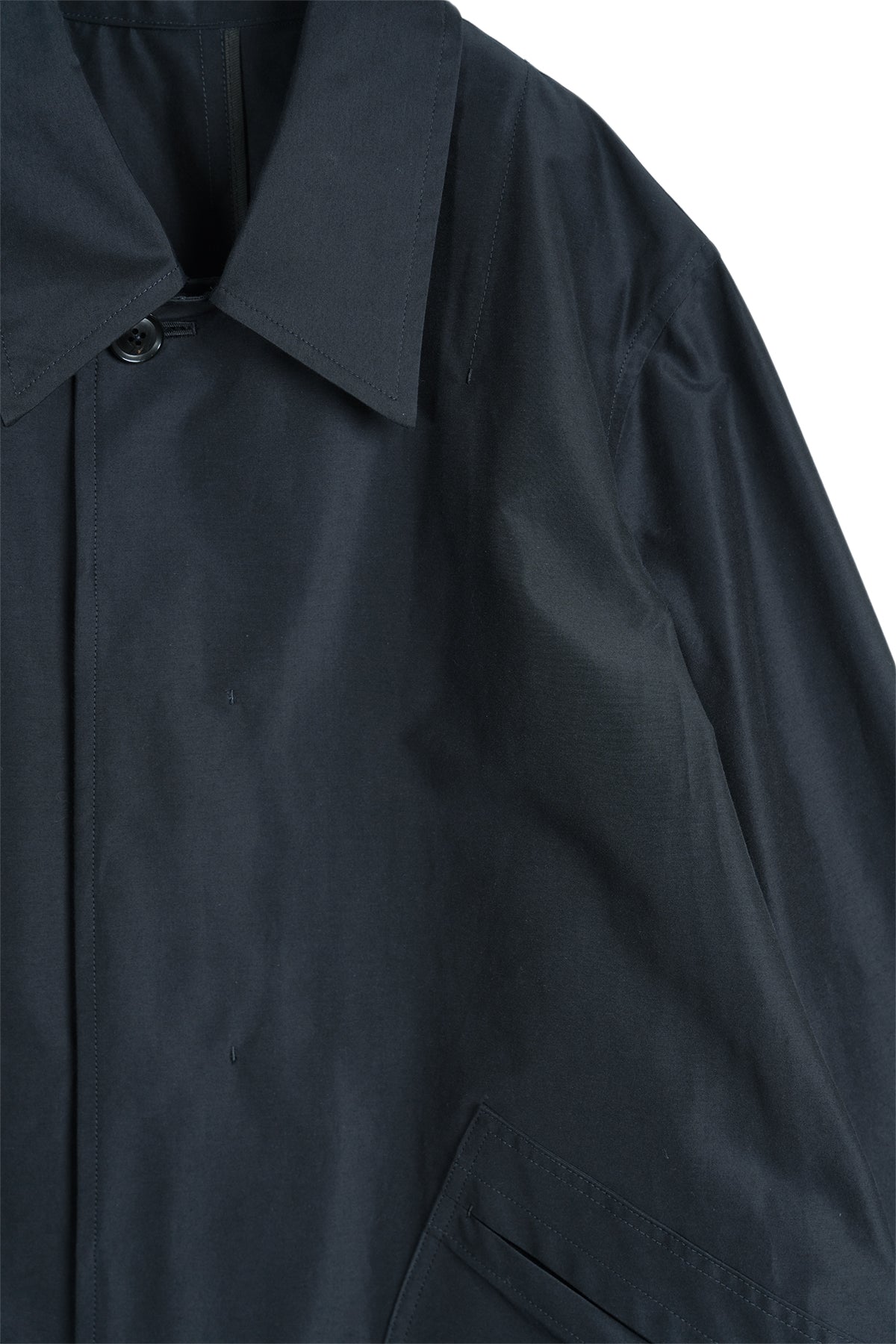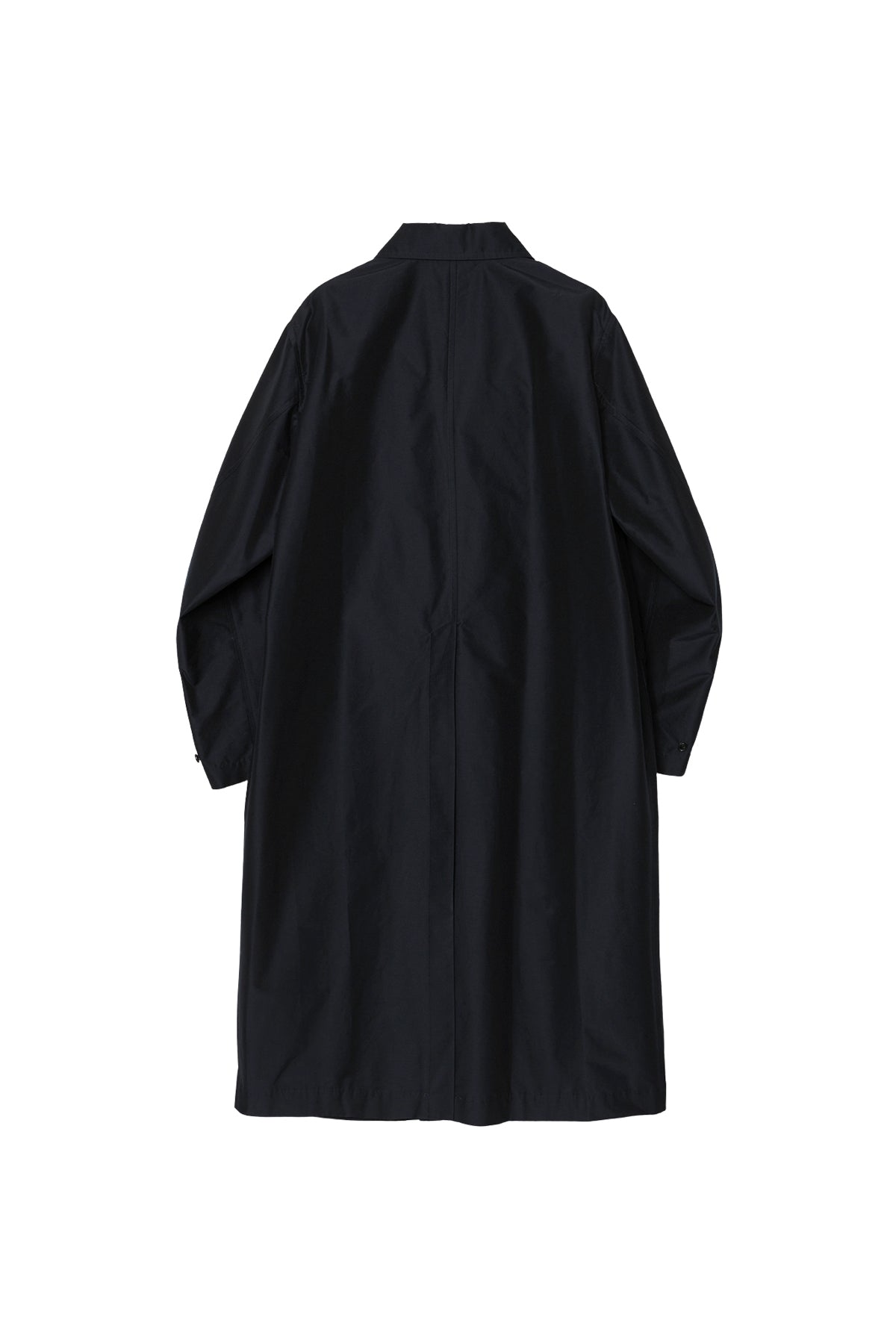 撥水加工を施したシルクコットン素材を使用した 一重仕立ての比翼あきバルカラーコート 。
