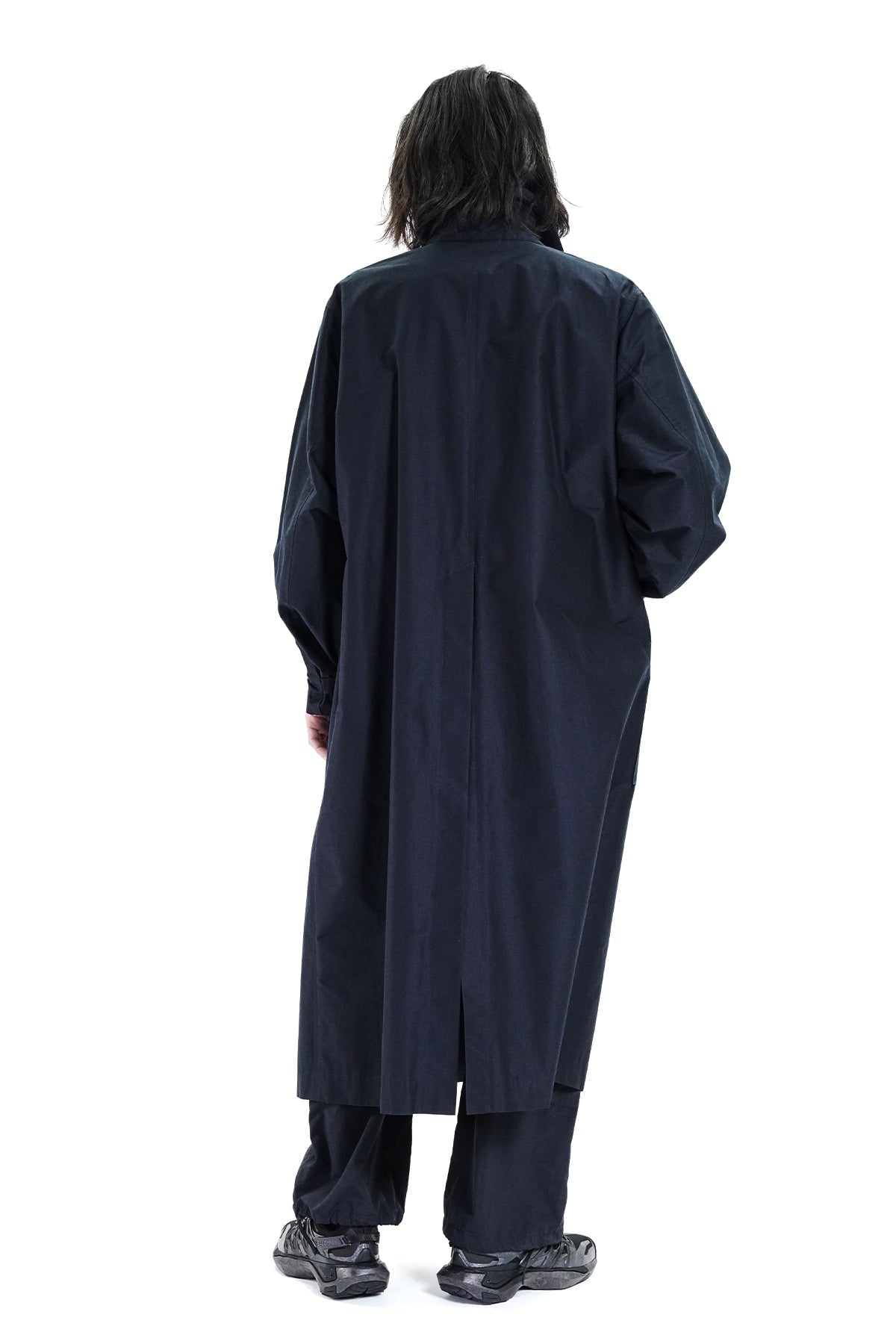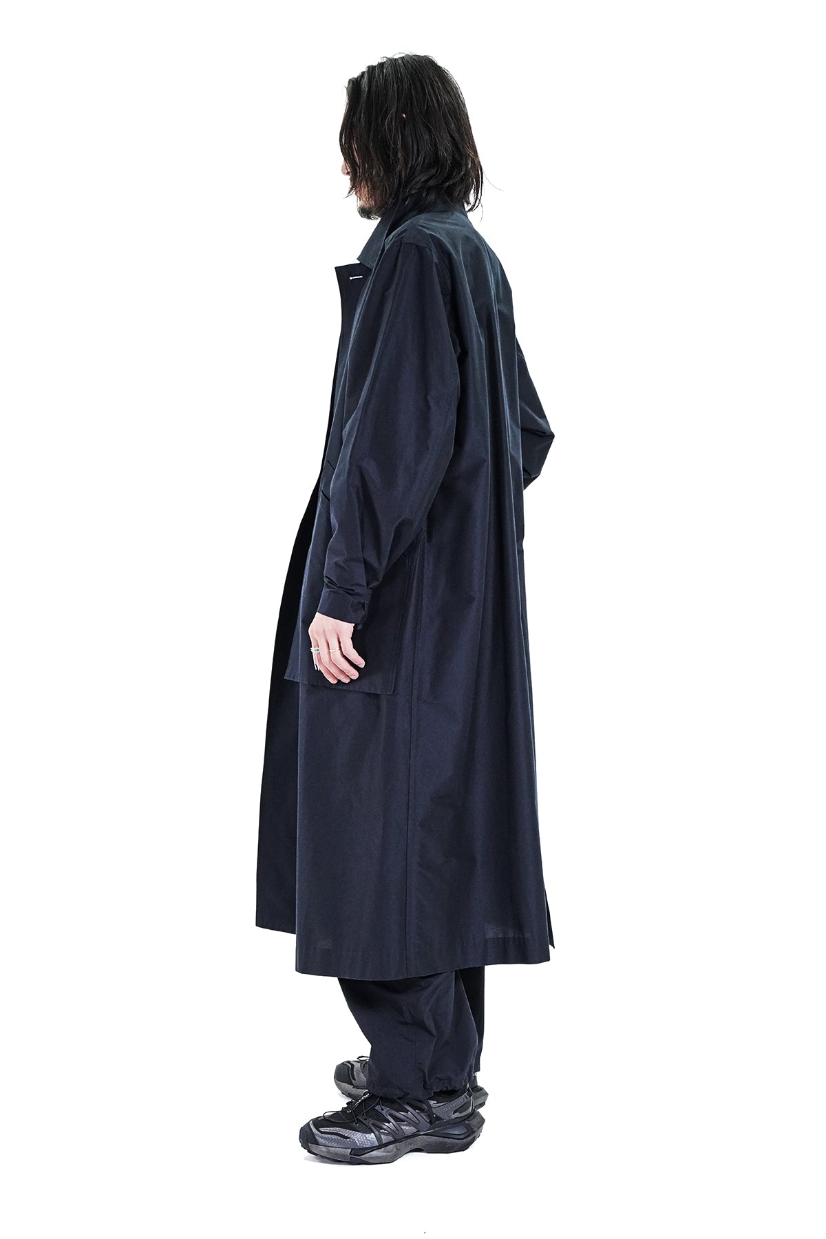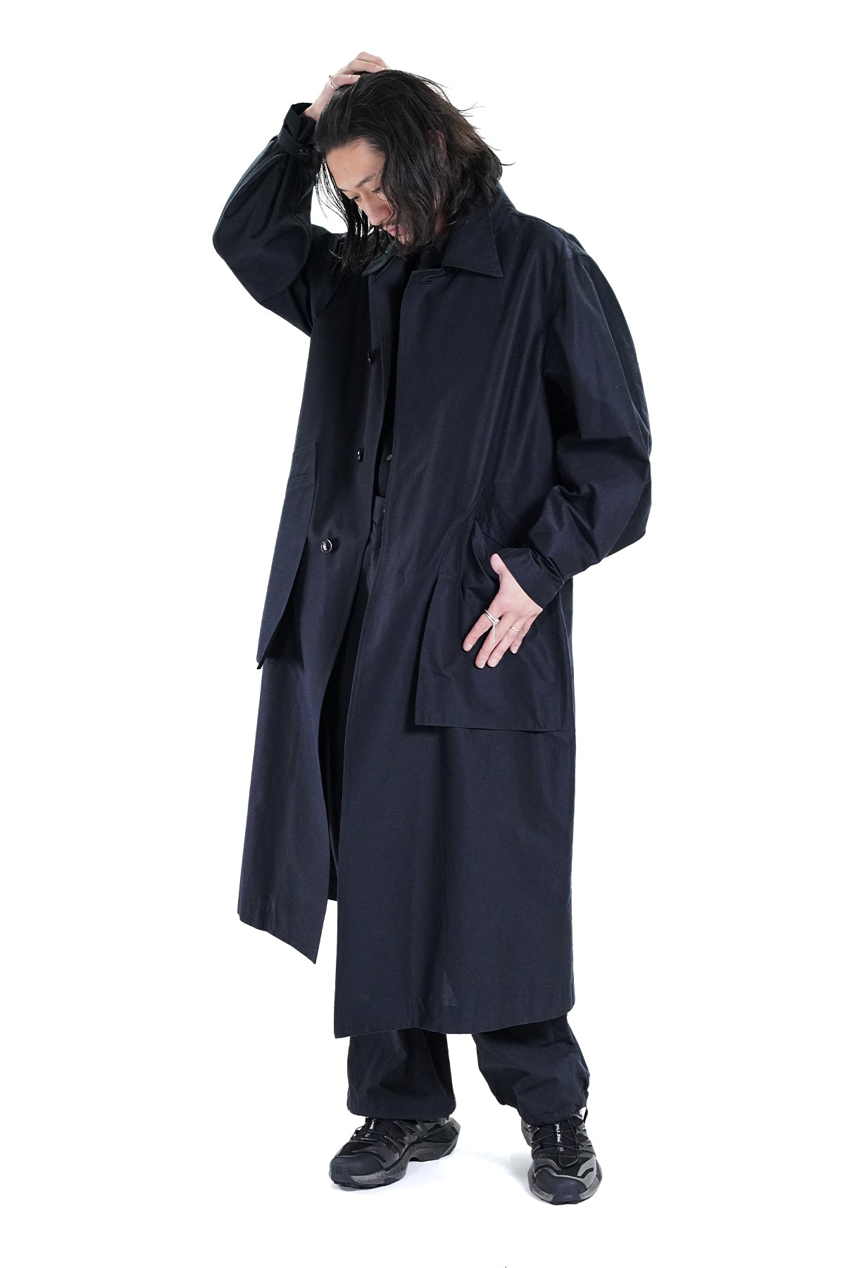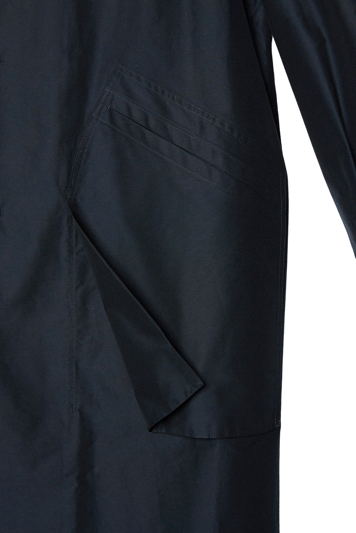 撥水加工を施したシルクコットン素材を使用した 一重仕立ての比翼あきバルカラーコート 。