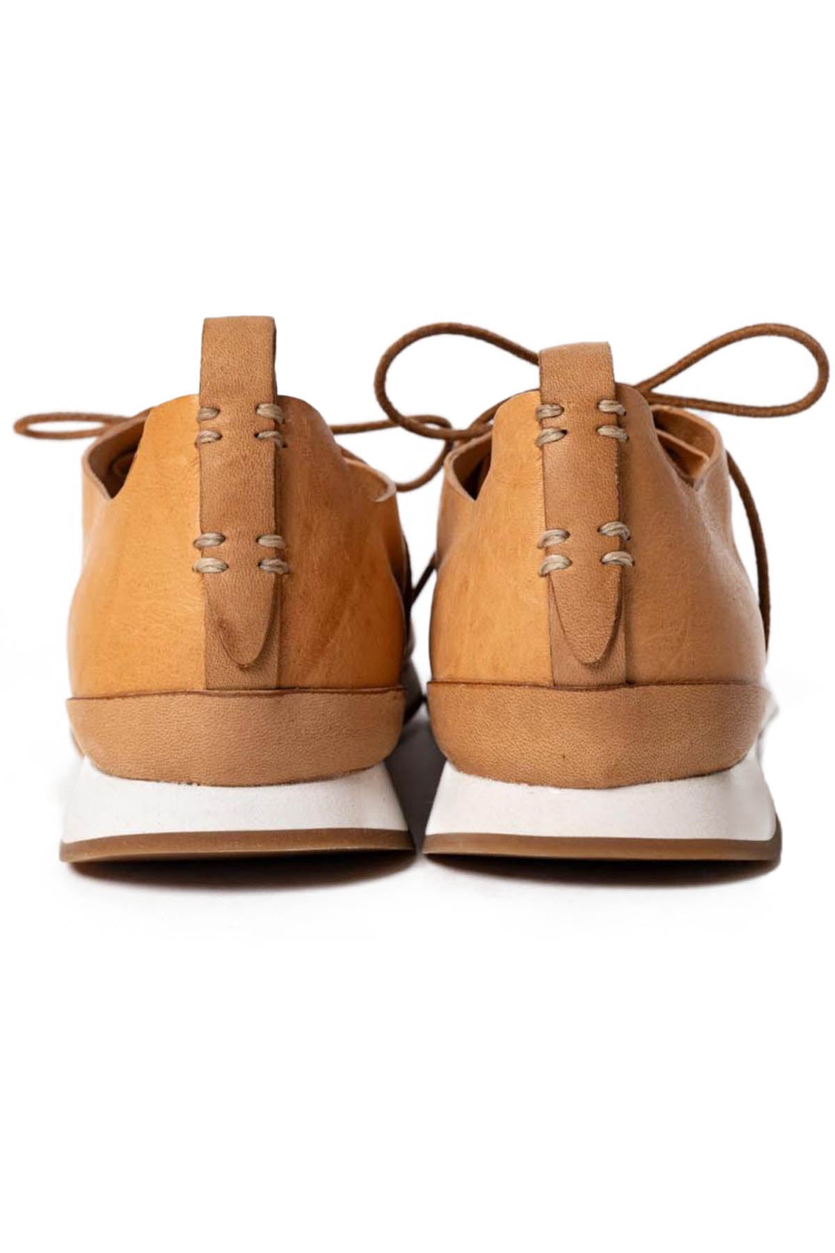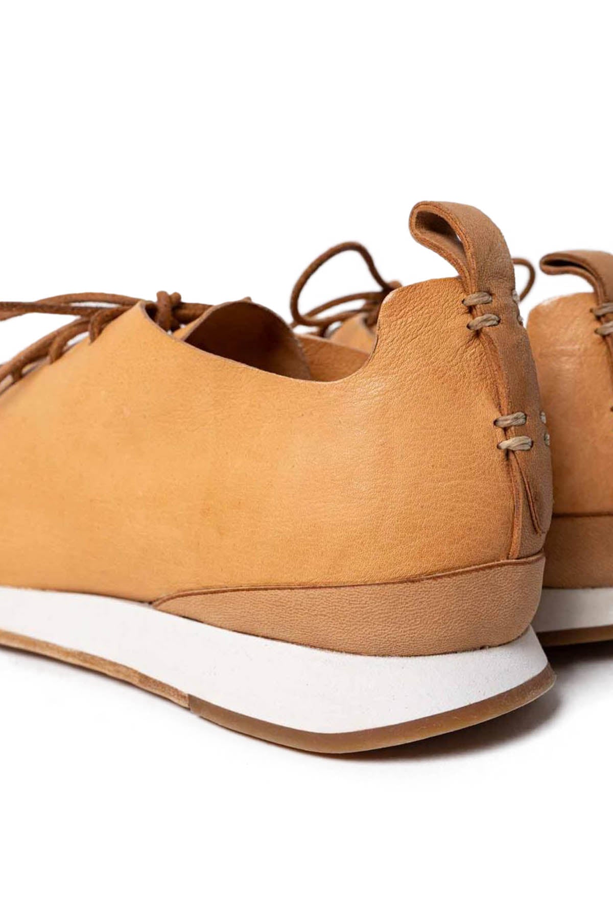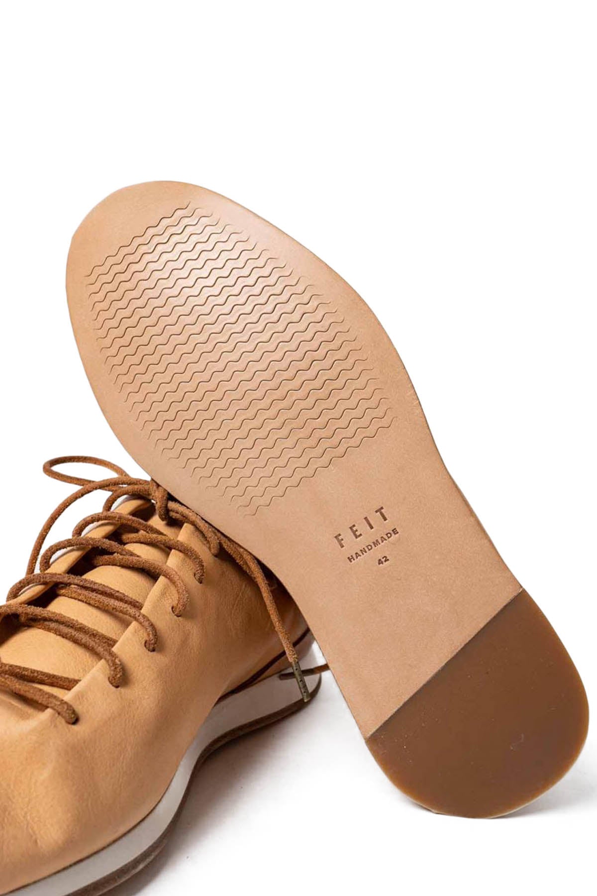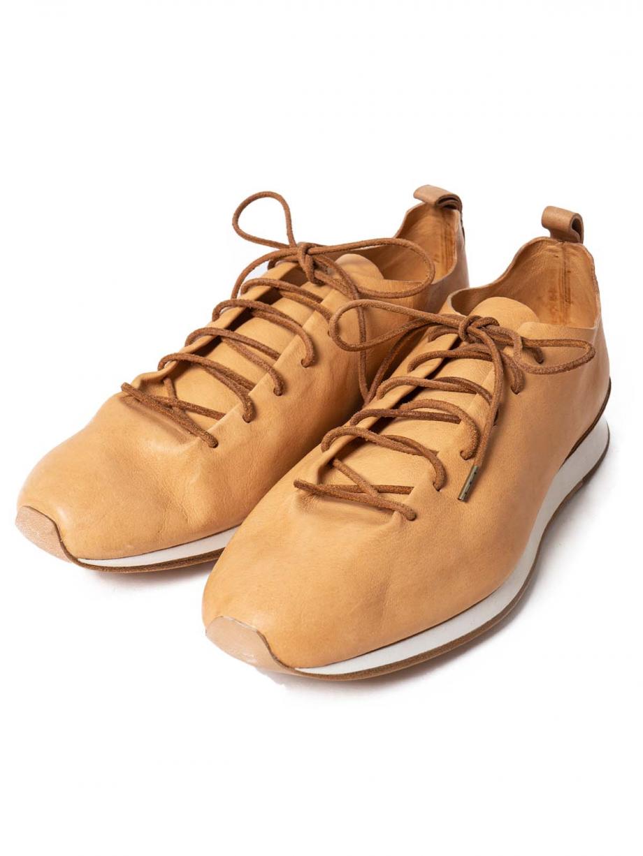 FEITを代表するモデル、RUNNER。機械を一切使わない完全なる一枚革のベンチメイド。ベンチメイドは一人の職人がレザーの裁断、ソールの貼り付け、レザーの吊り込みまで全て責任を持って制作するという方法です。使用されている素材はセミコードバン。伝統的な植物性タンニンによる、金属性のないタンニンを採用。鞣しになめられた革は、柔らかさと光沢を生んでいます。足型に沈む、インナーのコルクソール、クッション性の高いミドルソール、アウトソールはバッファローレザーにより耐久性を加え、かかと部分はゴムソールにて補強しています。
