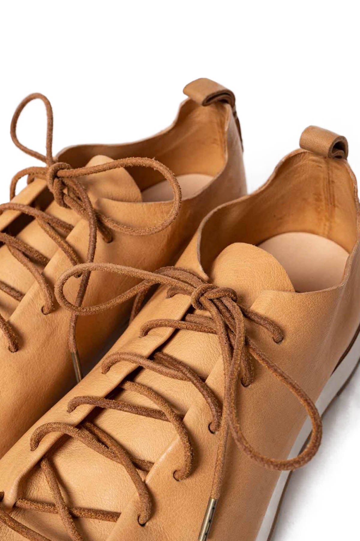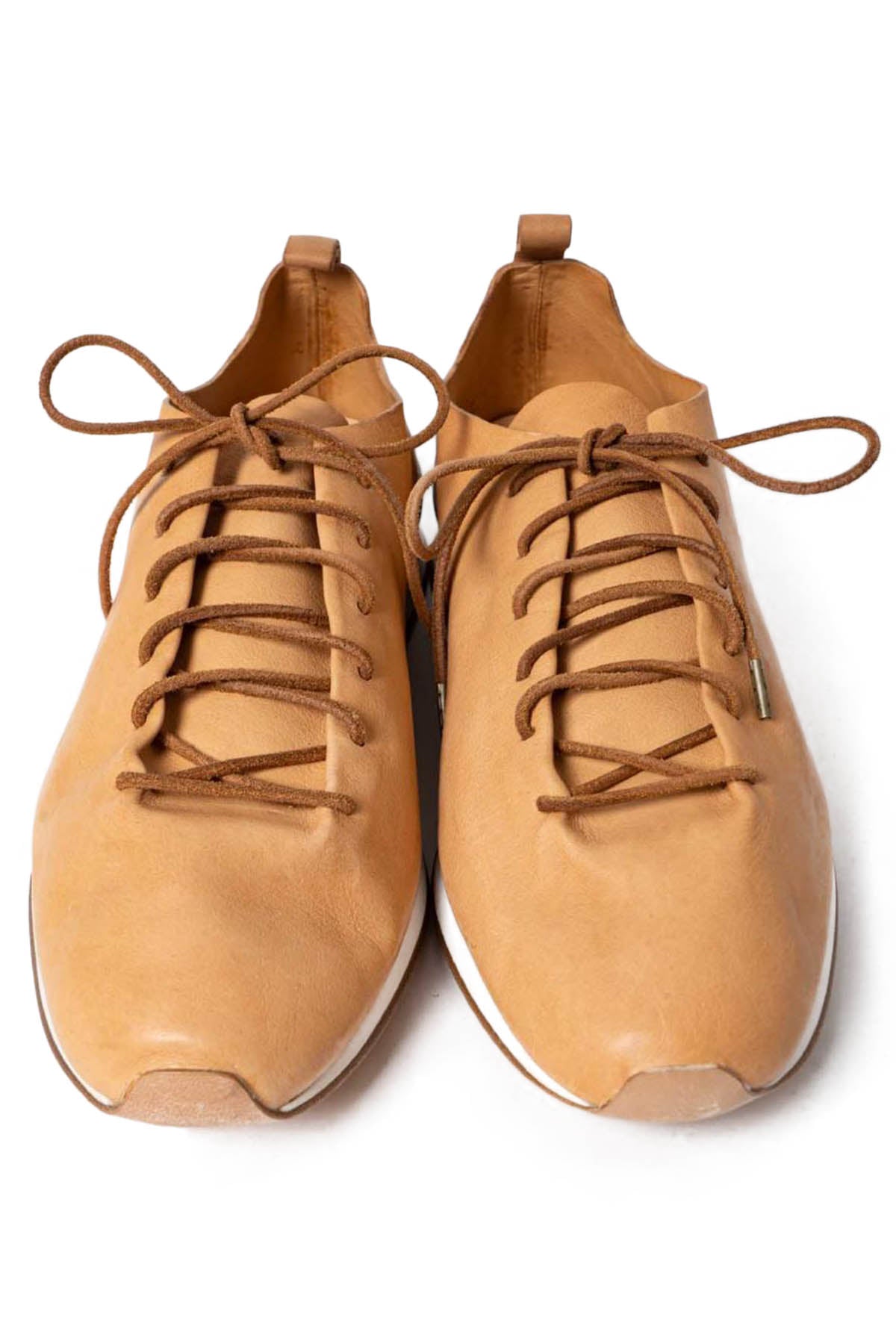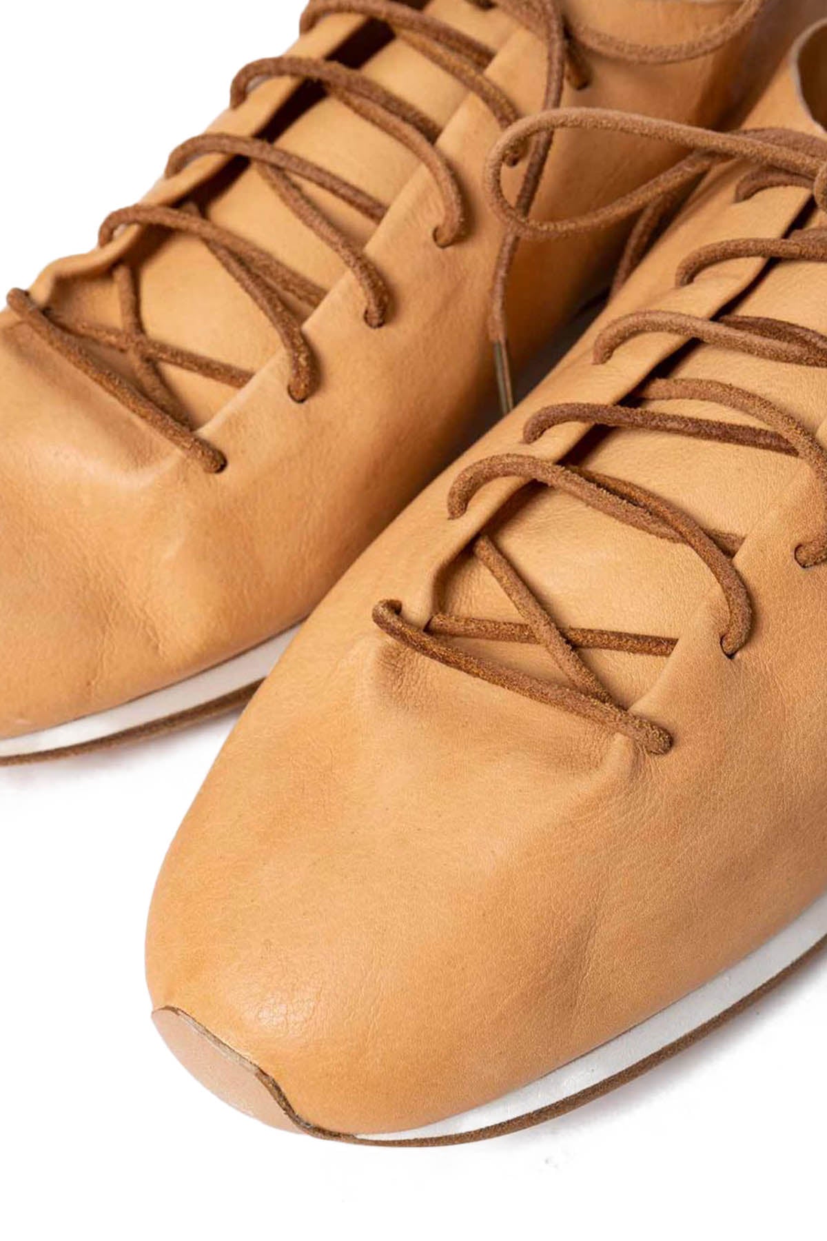 FEITを代表するモデル、RUNNER。機械を一切使わない完全なる一枚革のベンチメイド。ベンチメイドは一人の職人がレザーの裁断、ソールの貼り付け、レザーの吊り込みまで全て責任を持って制作するという方法です。使用されている素材はセミコードバン。伝統的な植物性タンニンによる、金属性のないタンニンを採用。鞣しになめられた革は、柔らかさと光沢を生んでいます。足型に沈む、インナーのコルクソール、クッション性の高いミドルソール、アウトソールはバッファローレザーにより耐久性を加え、かかと部分はゴムソールにて補強しています。