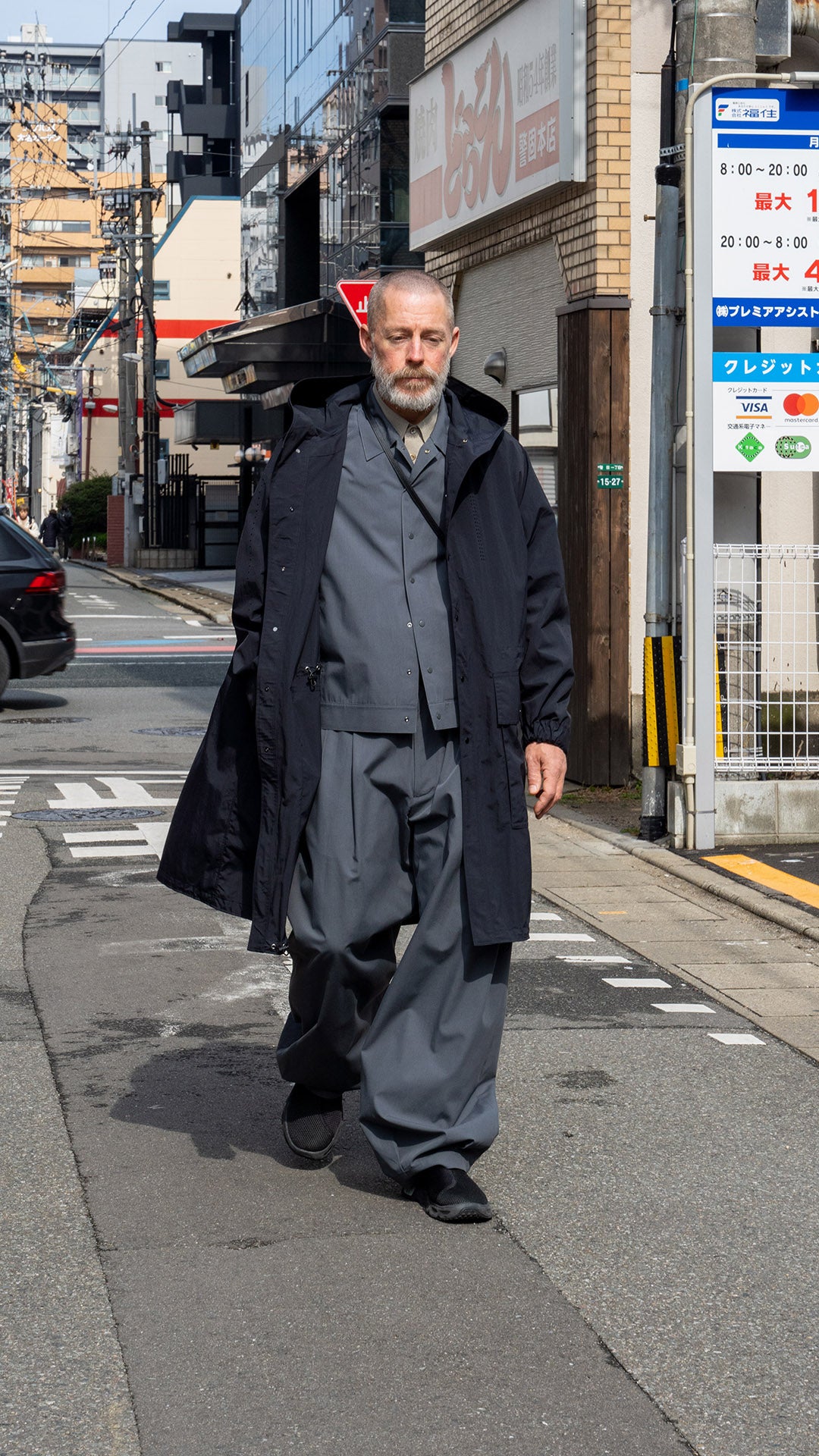 前立てから続けられた立体的な衿周りのフード構造と、 後衿ぐりのタックによるボリュームを持たせたシルエットが特徴で、肩回りを柔らかくパターン設計しているので、どなたでも馴染む肩回りになっています。