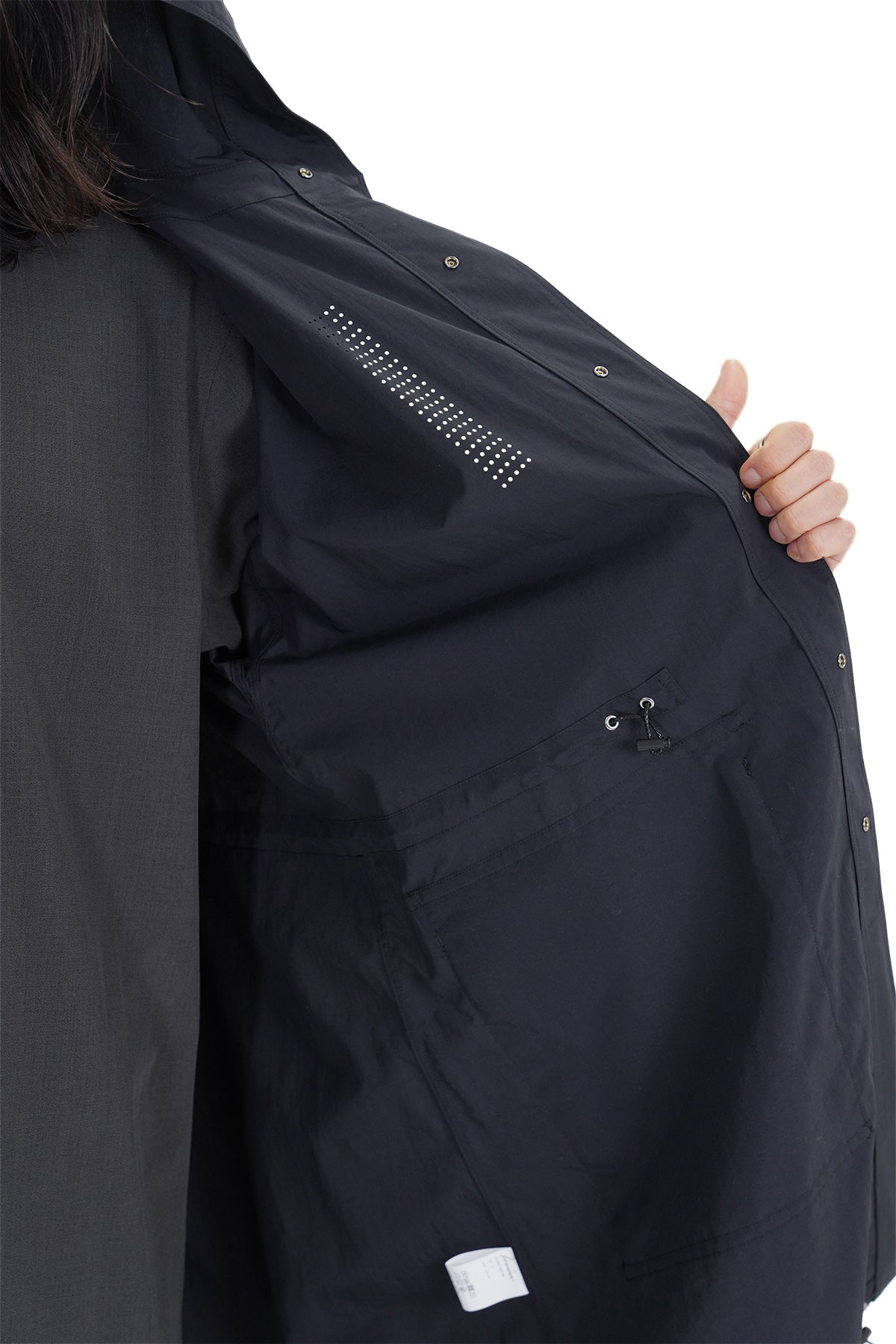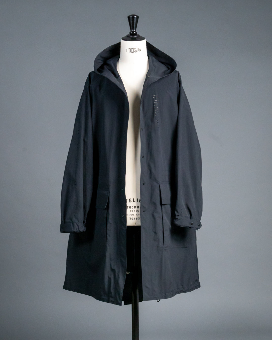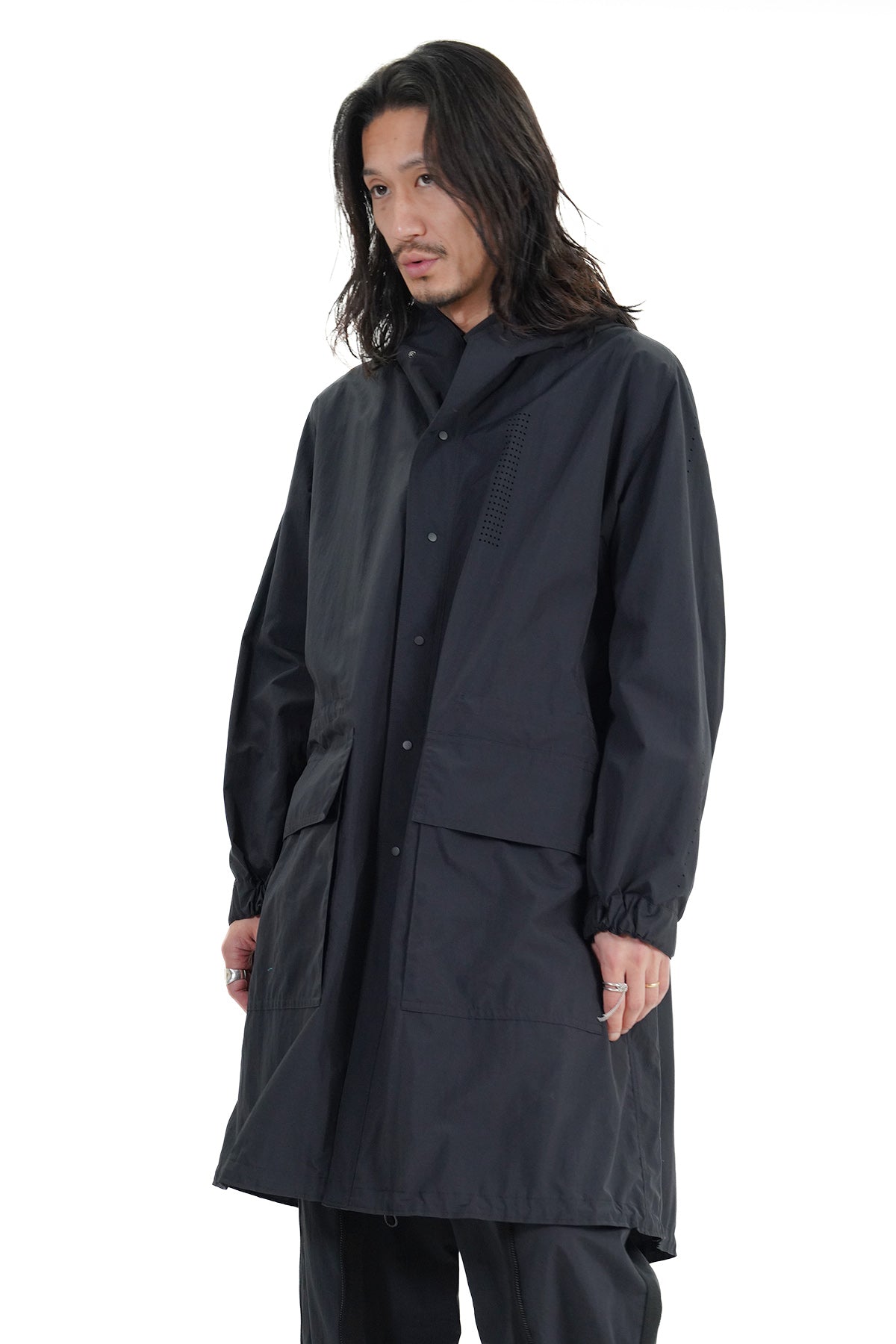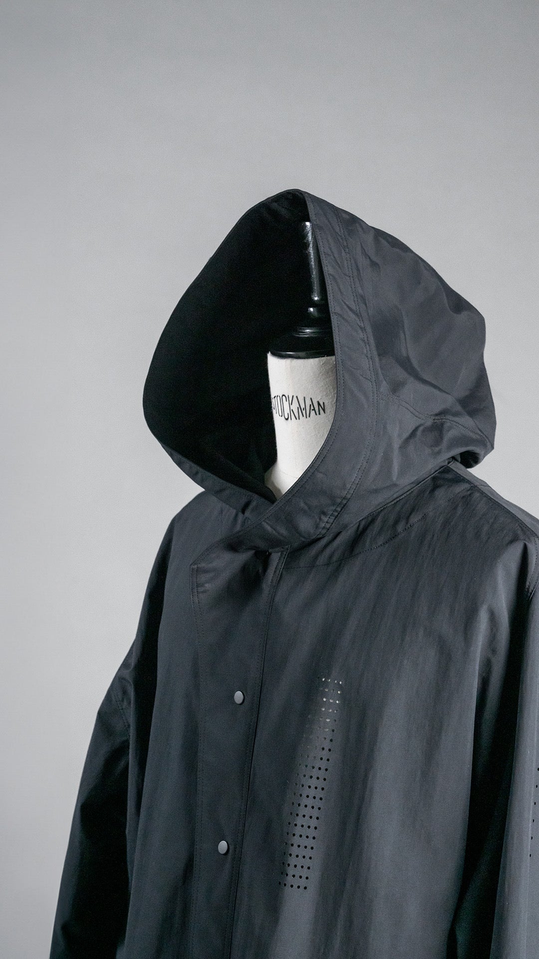 強撥水のナイロン素材を使用した、 一重仕立てのフード付きジップアップコート。