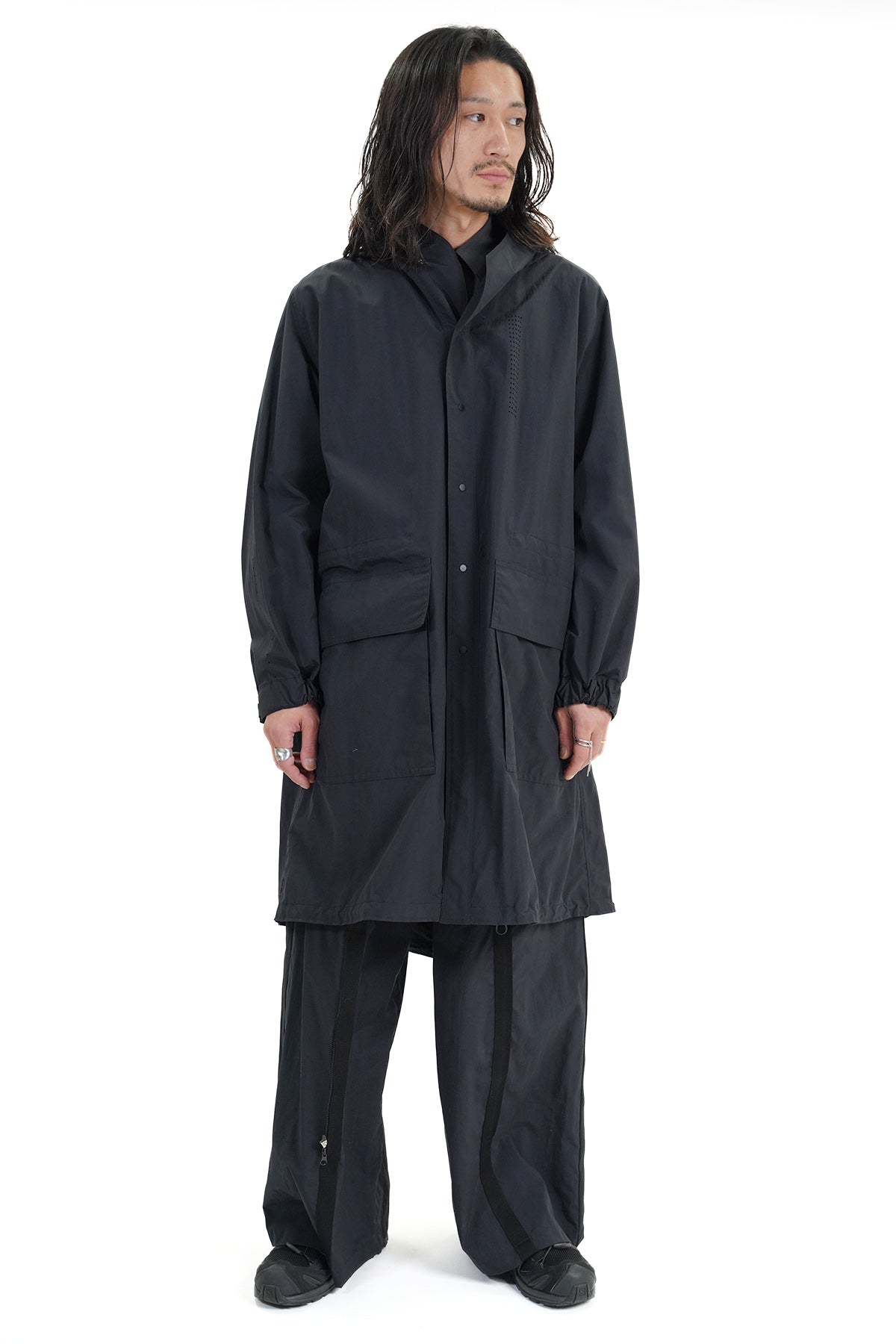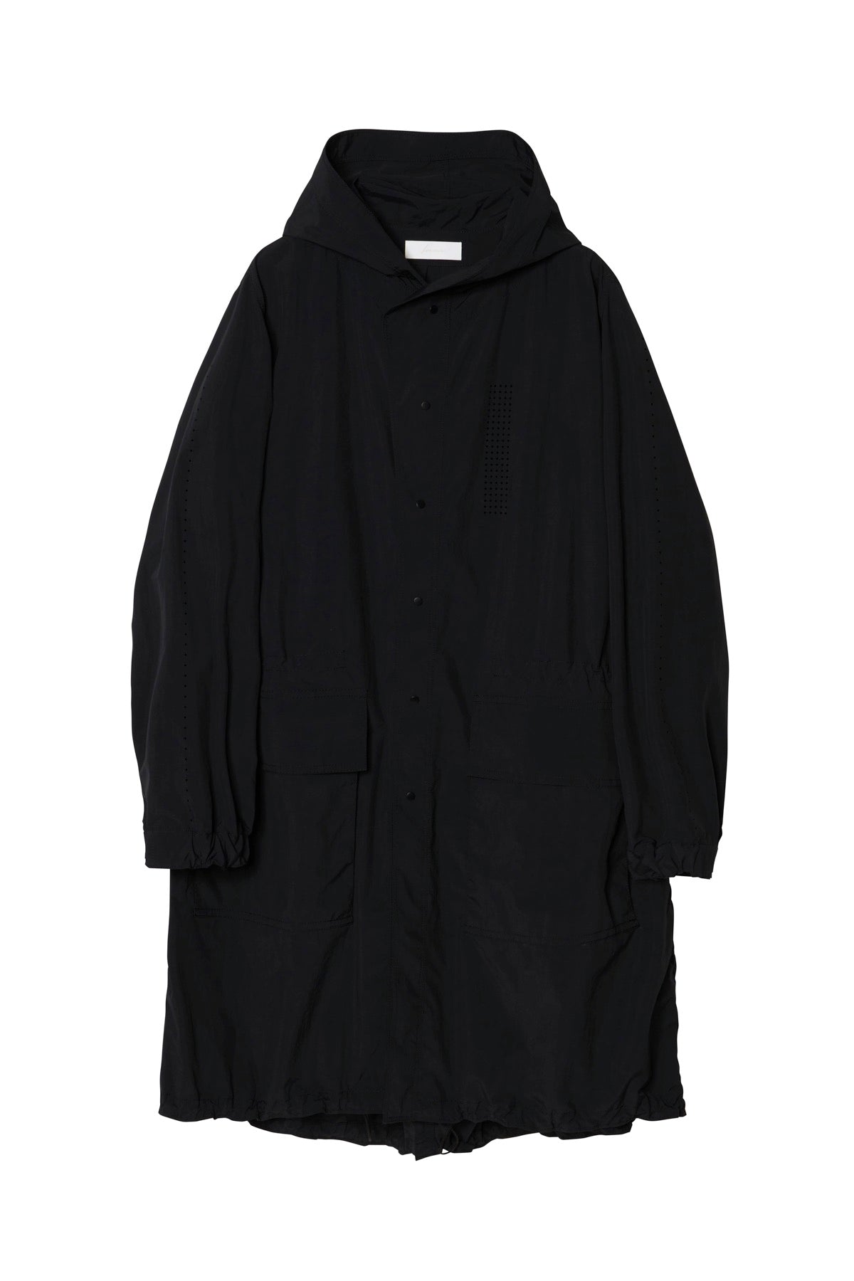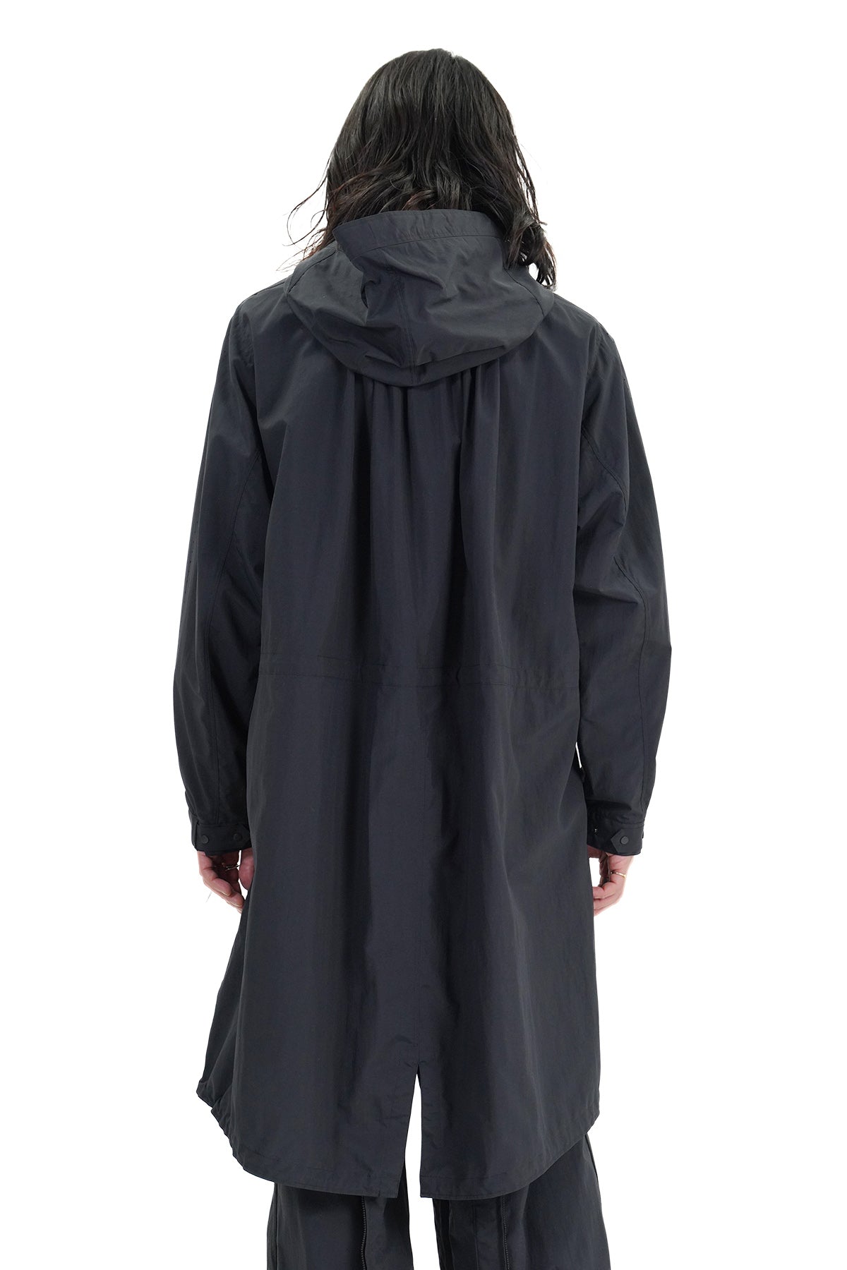 強撥水のナイロン素材を使用した、 一重仕立てのフード付きジップアップコート。