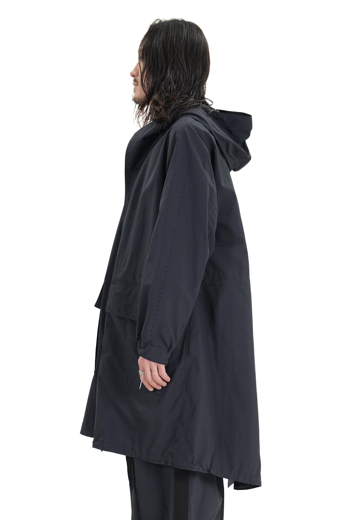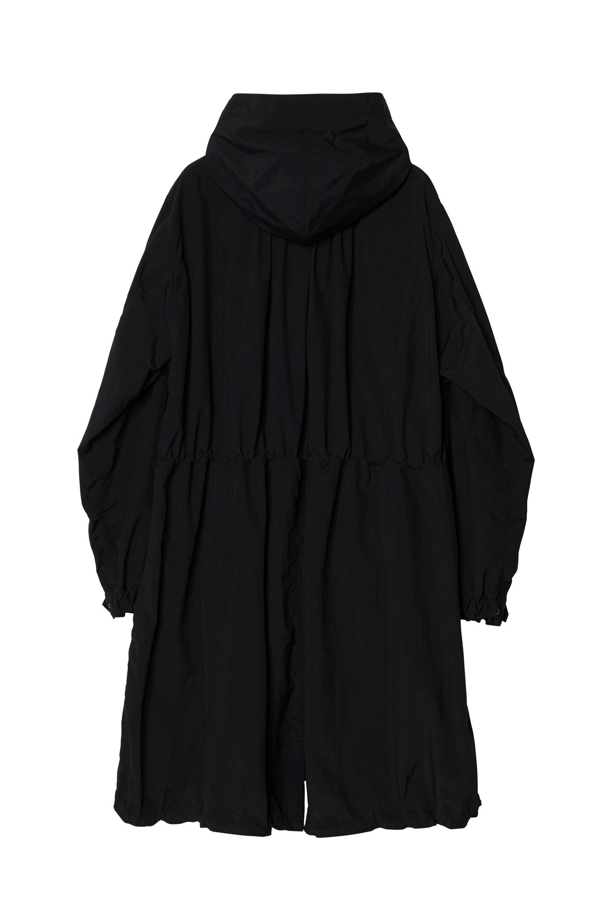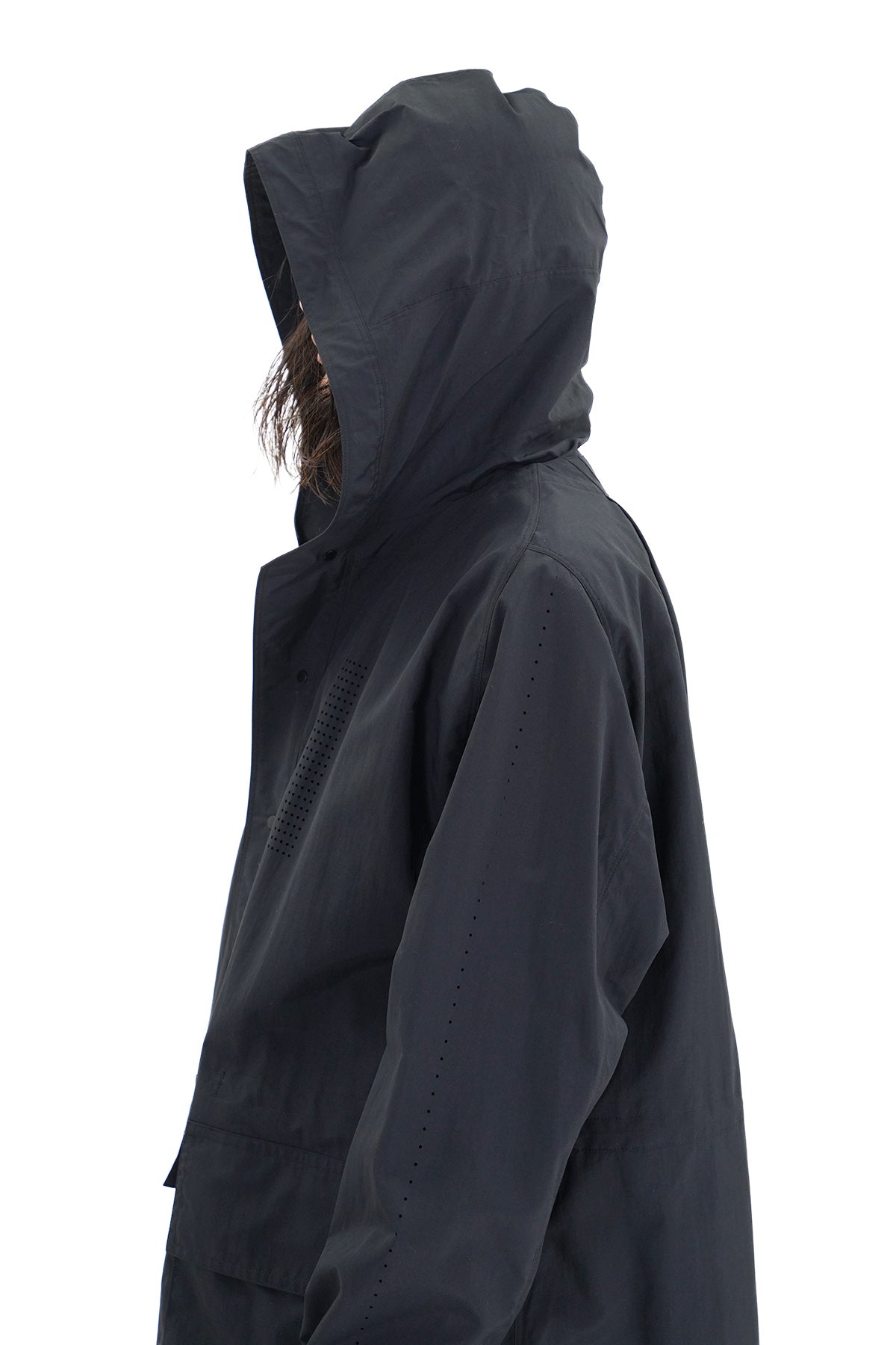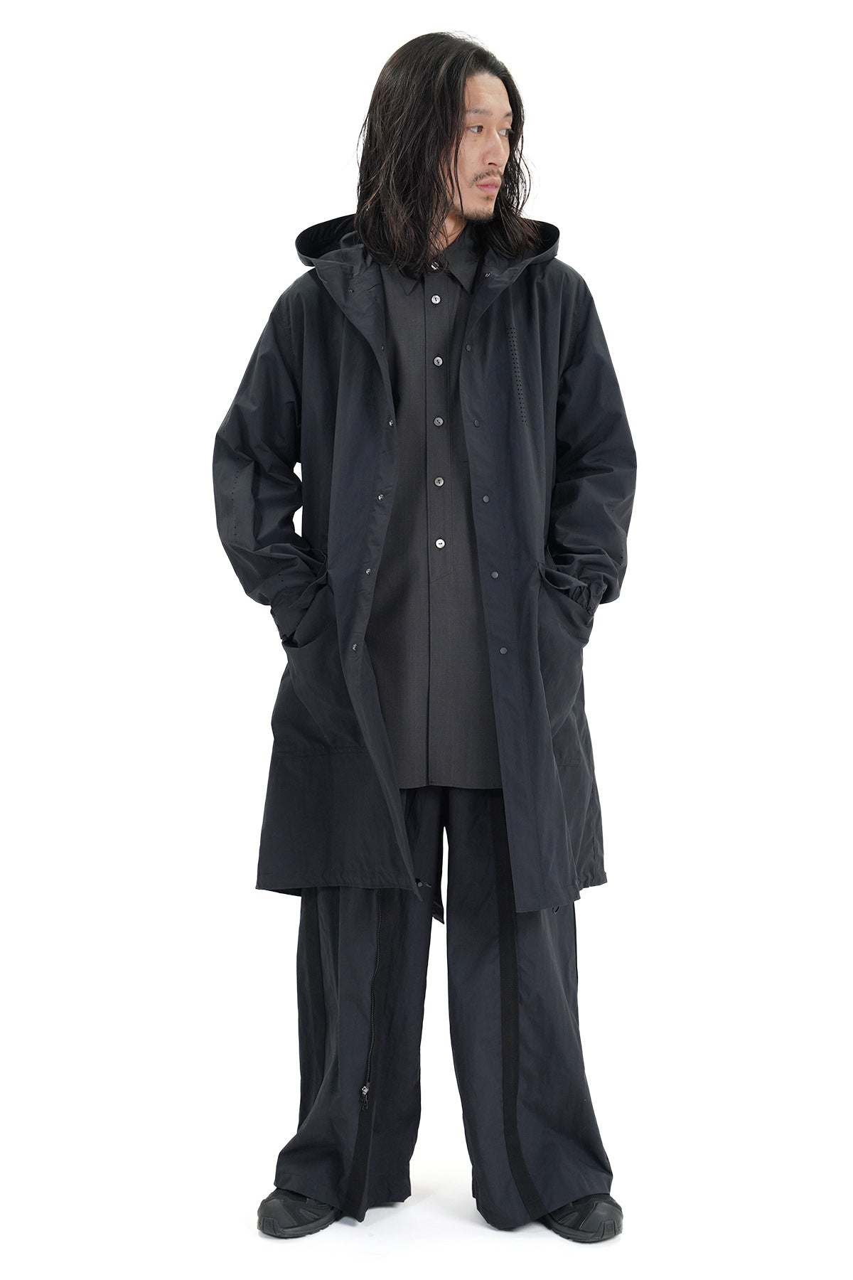 強撥水のナイロン素材を使用した、 一重仕立てのフード付きジップアップコート。