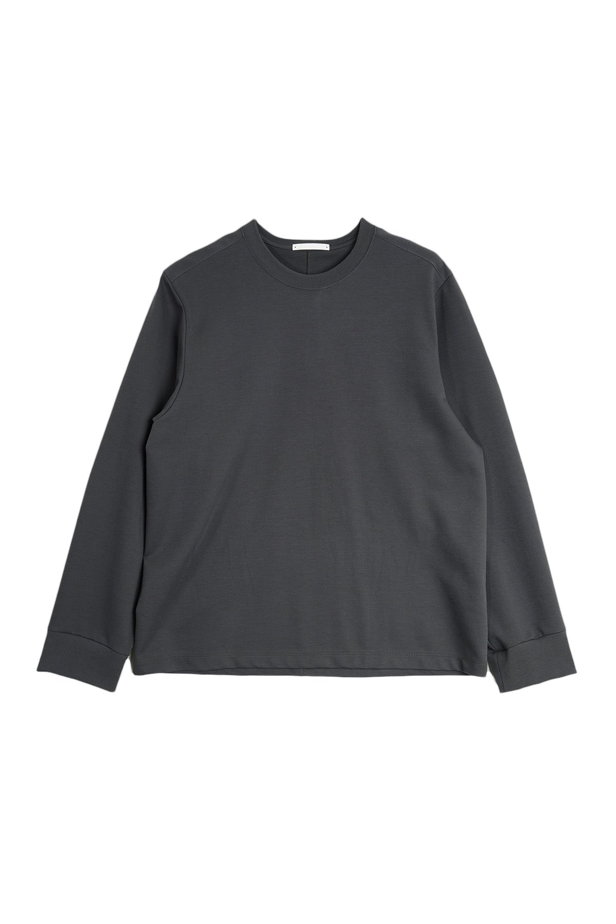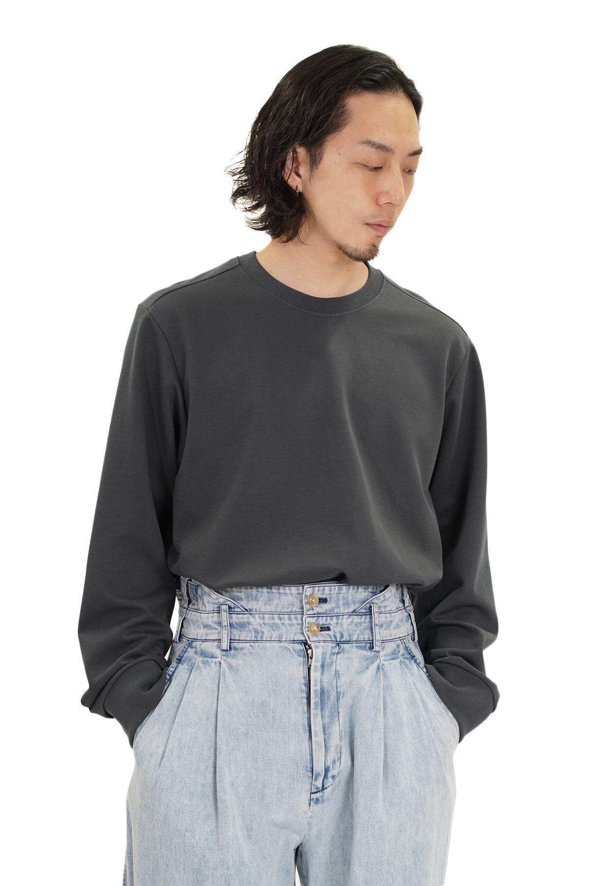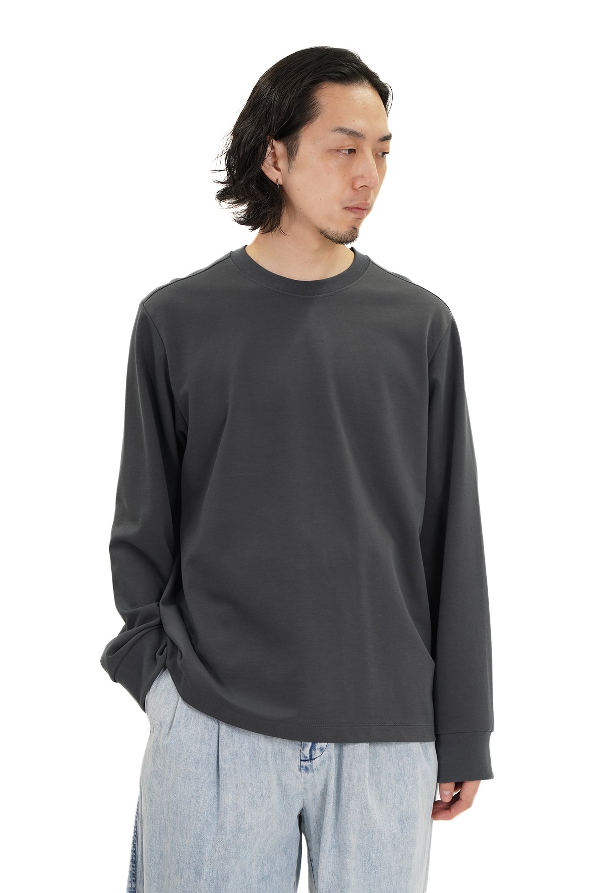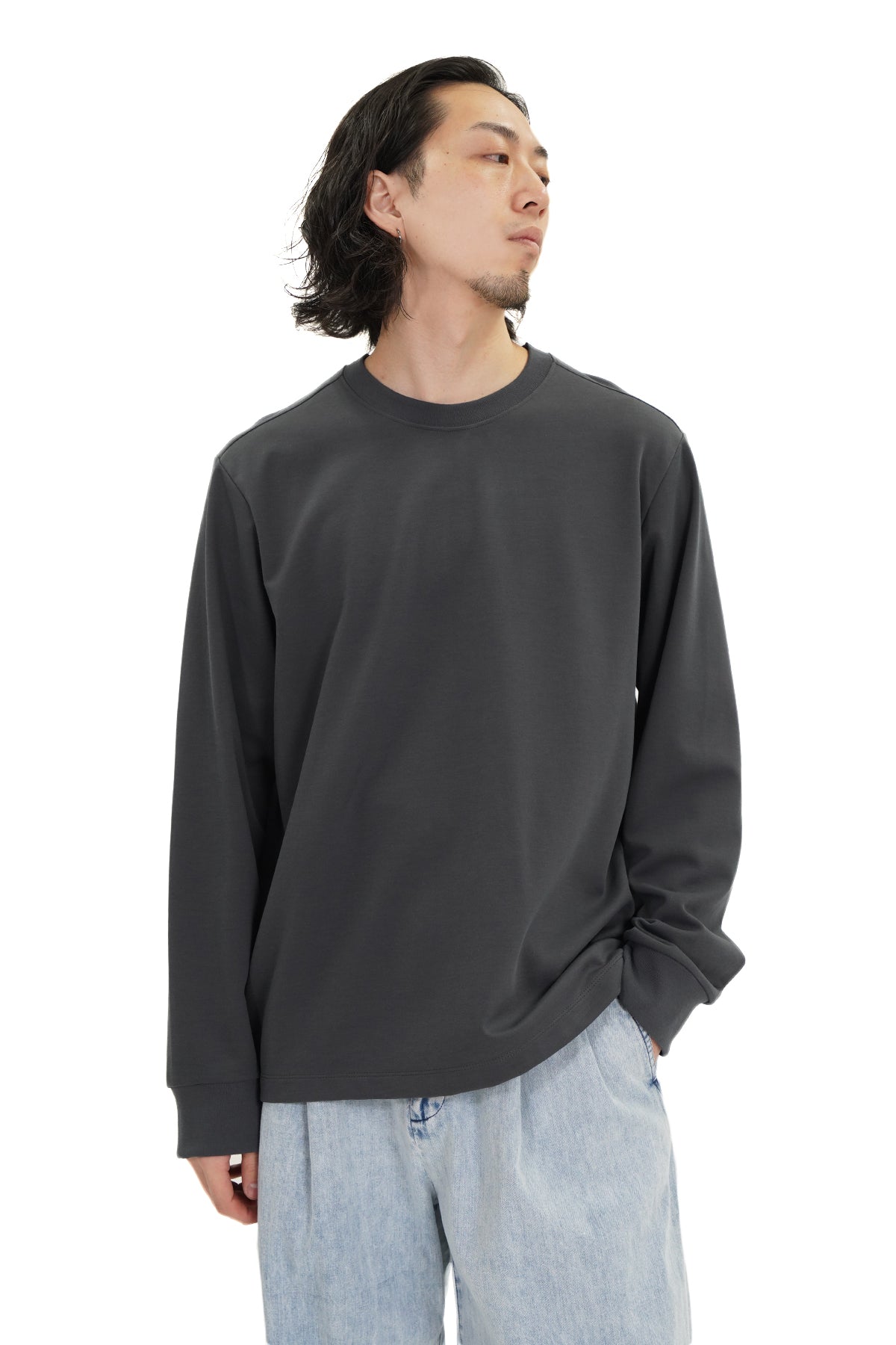 強撚の特殊2重編みのコットン素材を使用して、後衿ぐりにコードを入れた長袖Tシャツ。