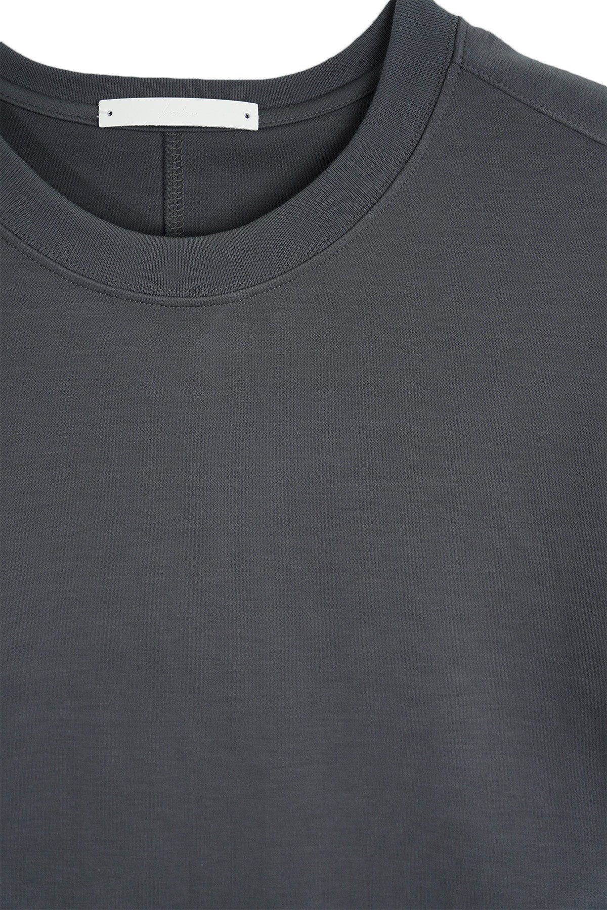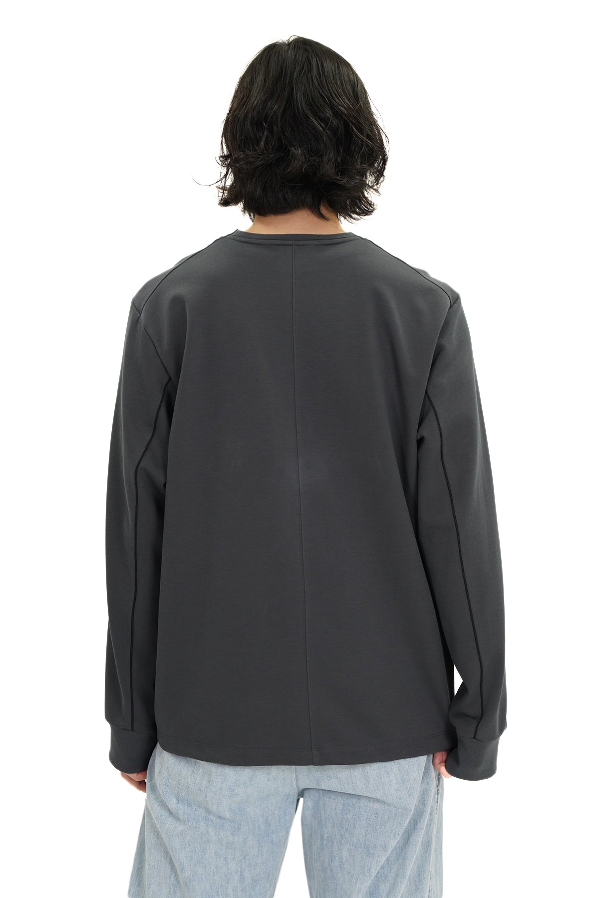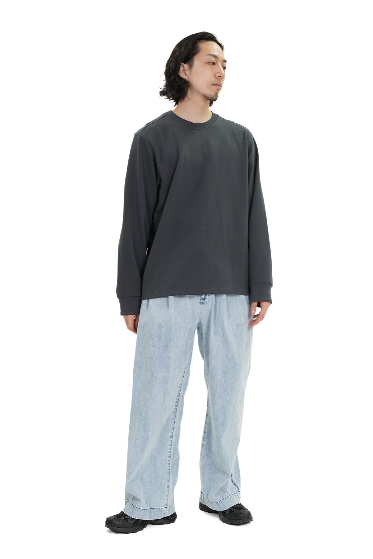 強撚の特殊2重編みのコットン素材を使用して、後衿ぐりにコードを入れた長袖Tシャツ。