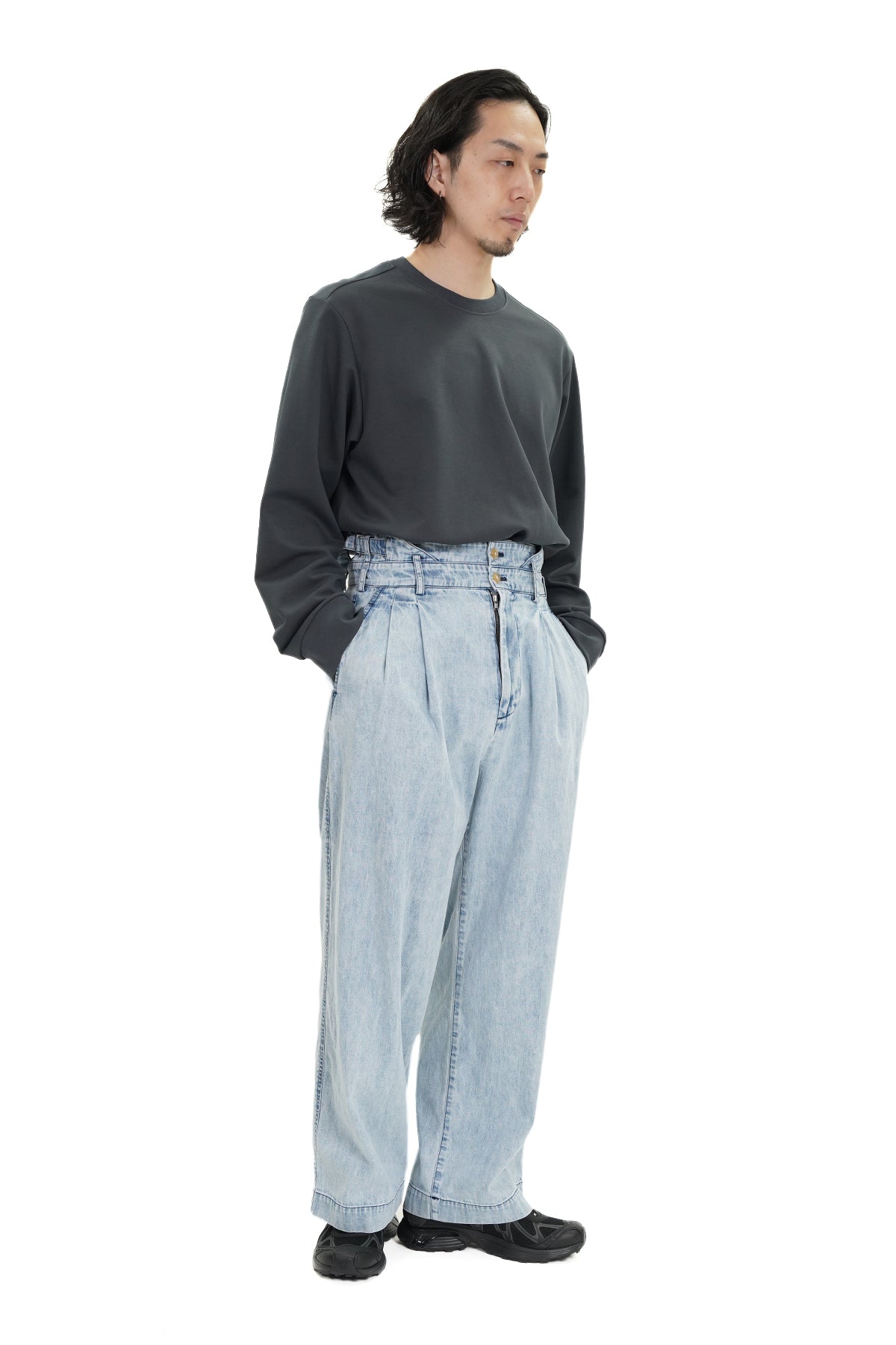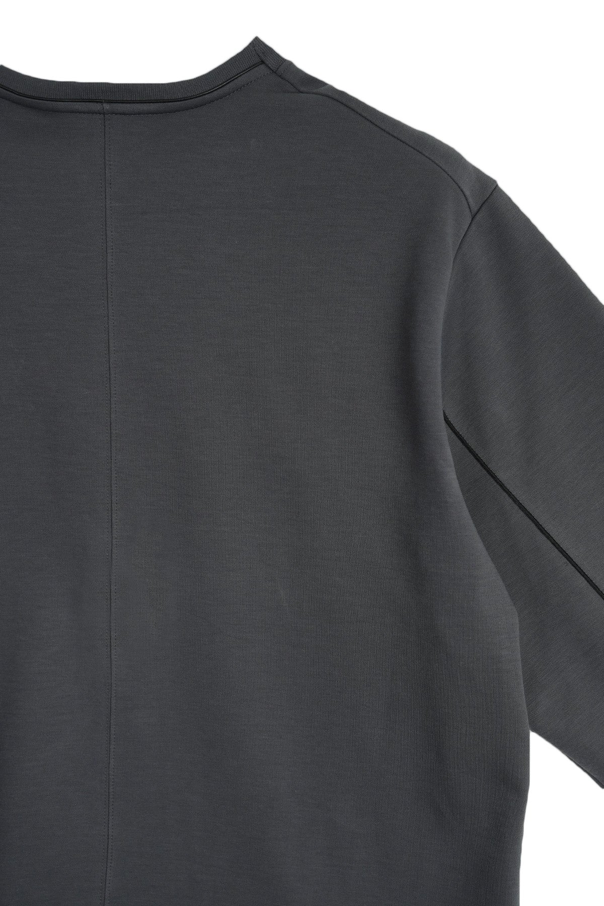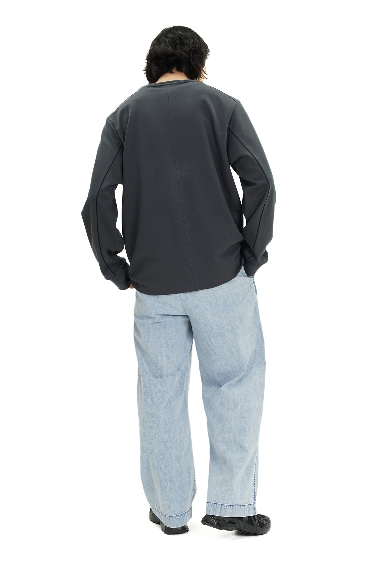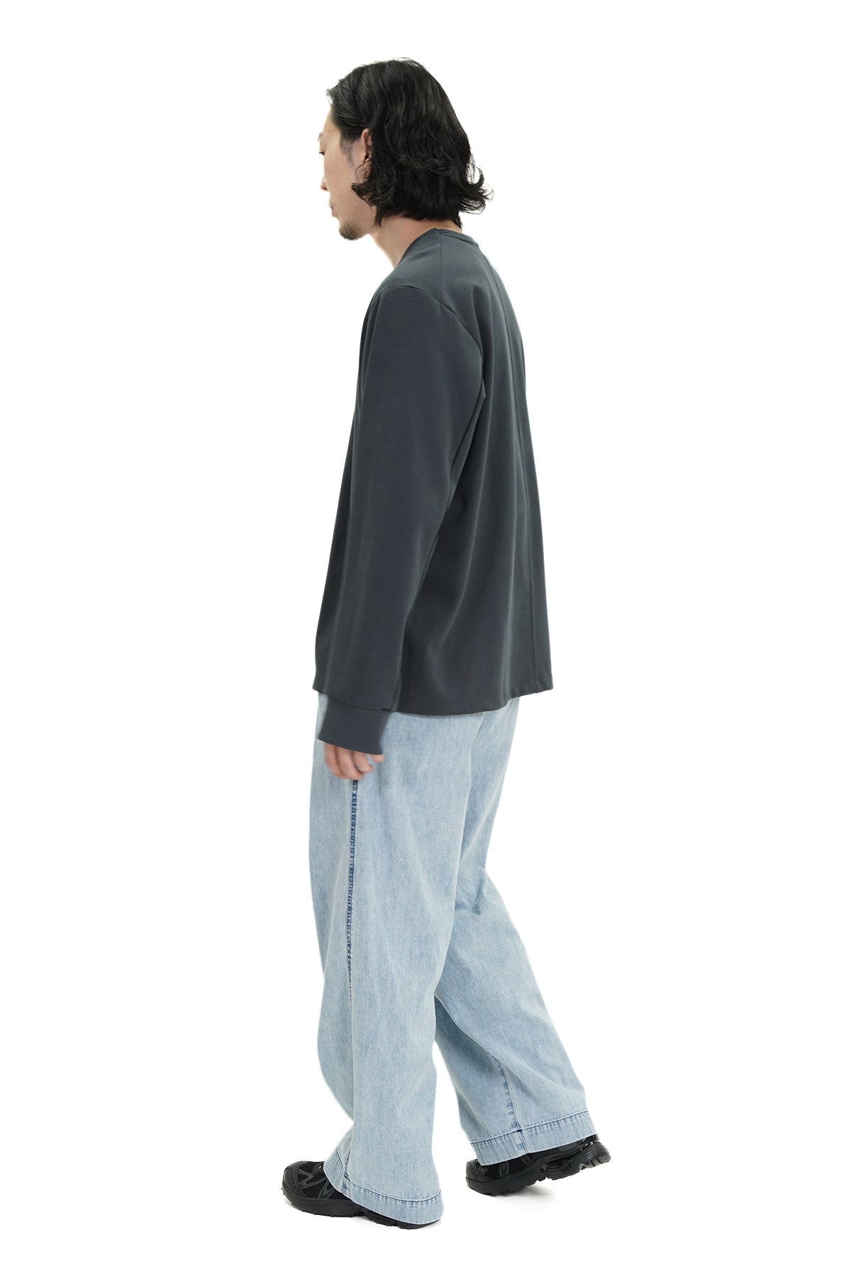 強撚の特殊2重編みのコットン素材を使用して、後衿ぐりにコードを入れた長袖Tシャツ。