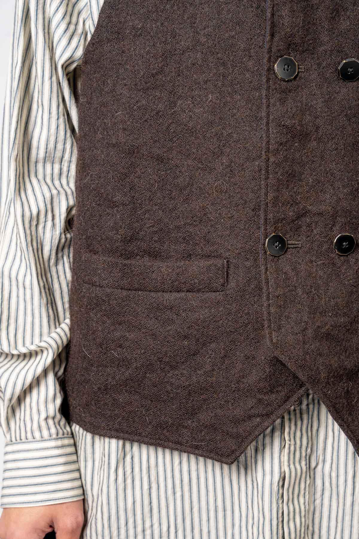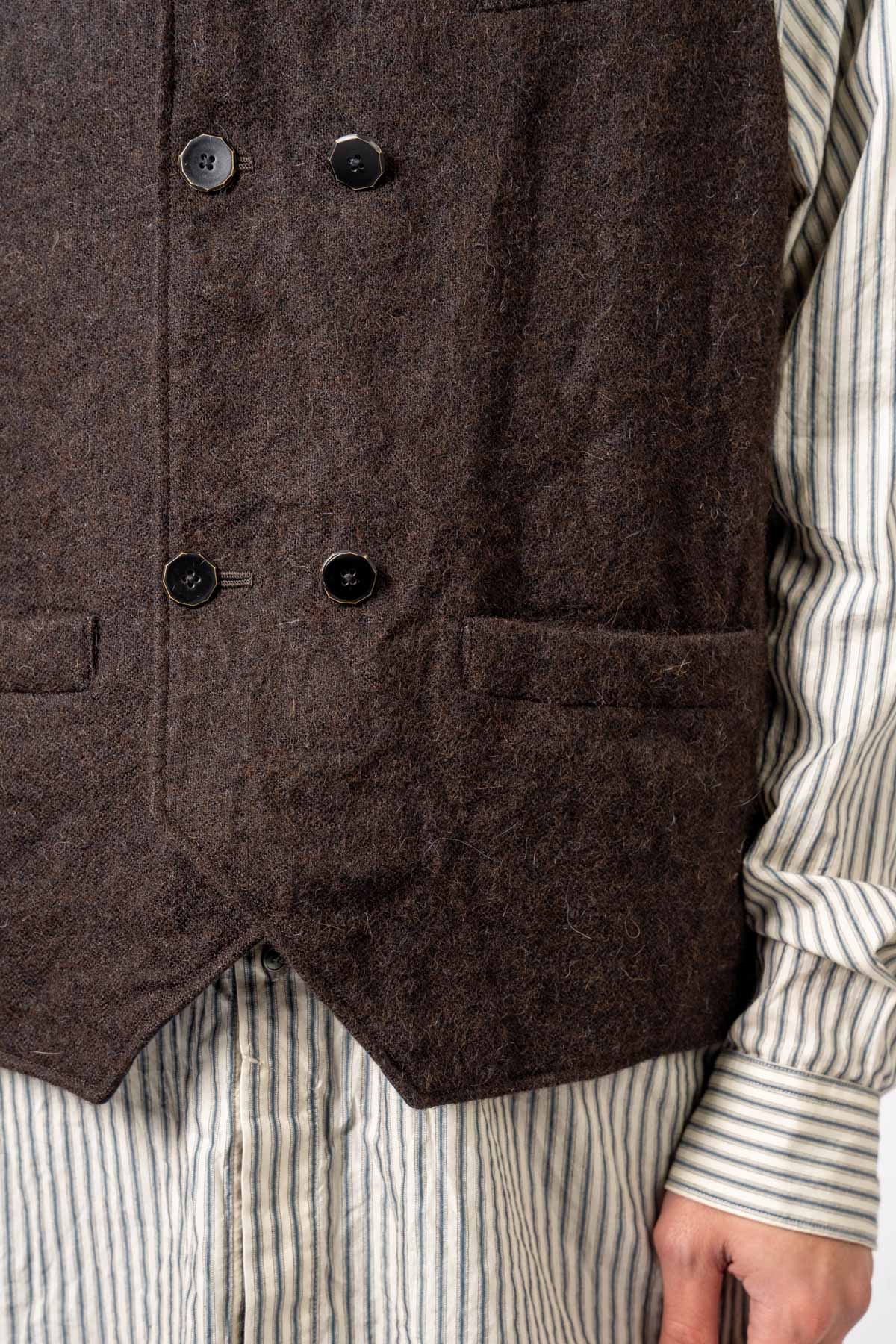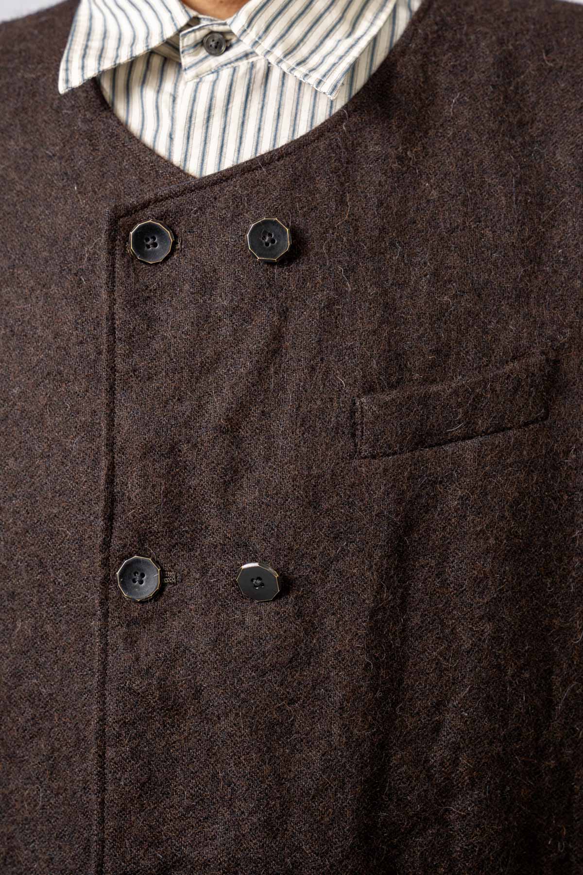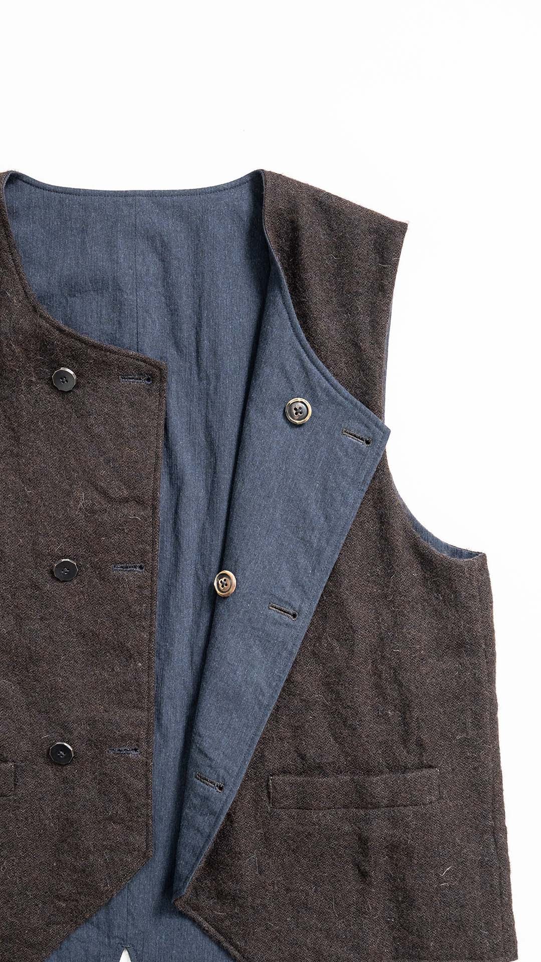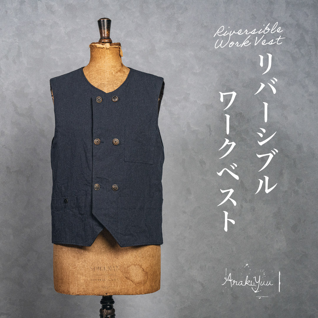 ARAKIYUUのワークベストです。まず、このベスト最大特徴はリバーシブル仕様だということ。表面ではオーセンティックなダブルブレストのウエストコートの雰囲気、もう一方の面ではディテールを変えることでワークな雰囲気に。ARAKIYUUらしい機能性とデザインを兼ね揃えた1着に仕上げています。表地の素材は遠州の機屋に眠っていたデッドストックの超高密度のコットン生地で、ミリタリーのヘリンボーンツイルのような質感の素材です。そして、裏返すとブラウンカラーのフランネル生地。アルパカ糸を使用し、二重織の組織で織り上げ、ゆっくりと時間をかけて縮絨させた素材です。ブランドのアイコンである真鍮ボタンはハンドで叩きを入れブラックコーティングを施しています。このコーティングが使用感によって剥げてきたときのブラックの生地とゴールドのボタンがコントラストを生みます。