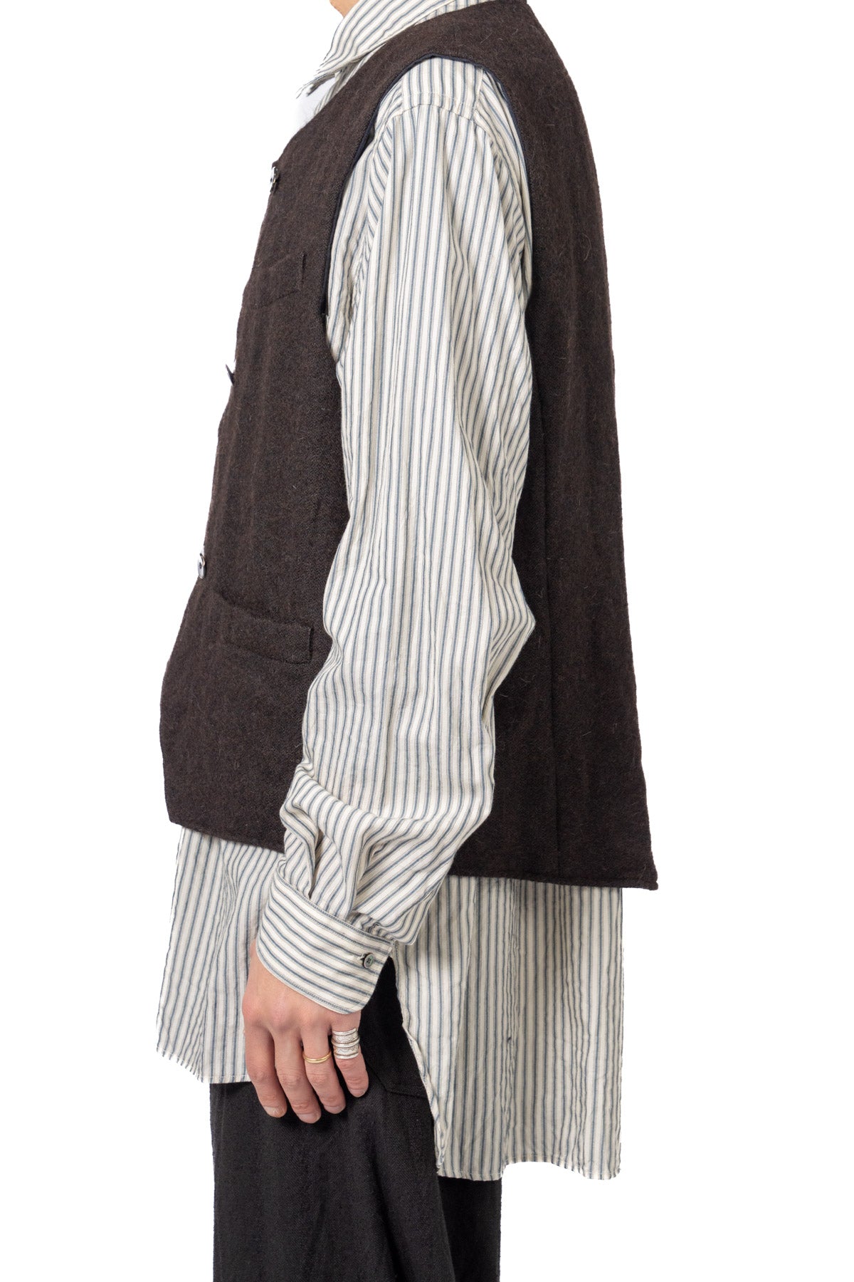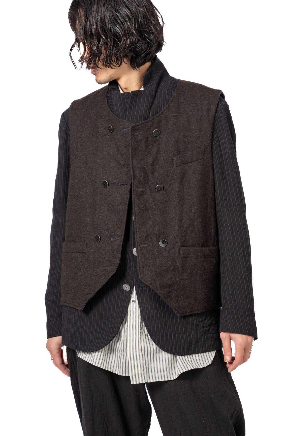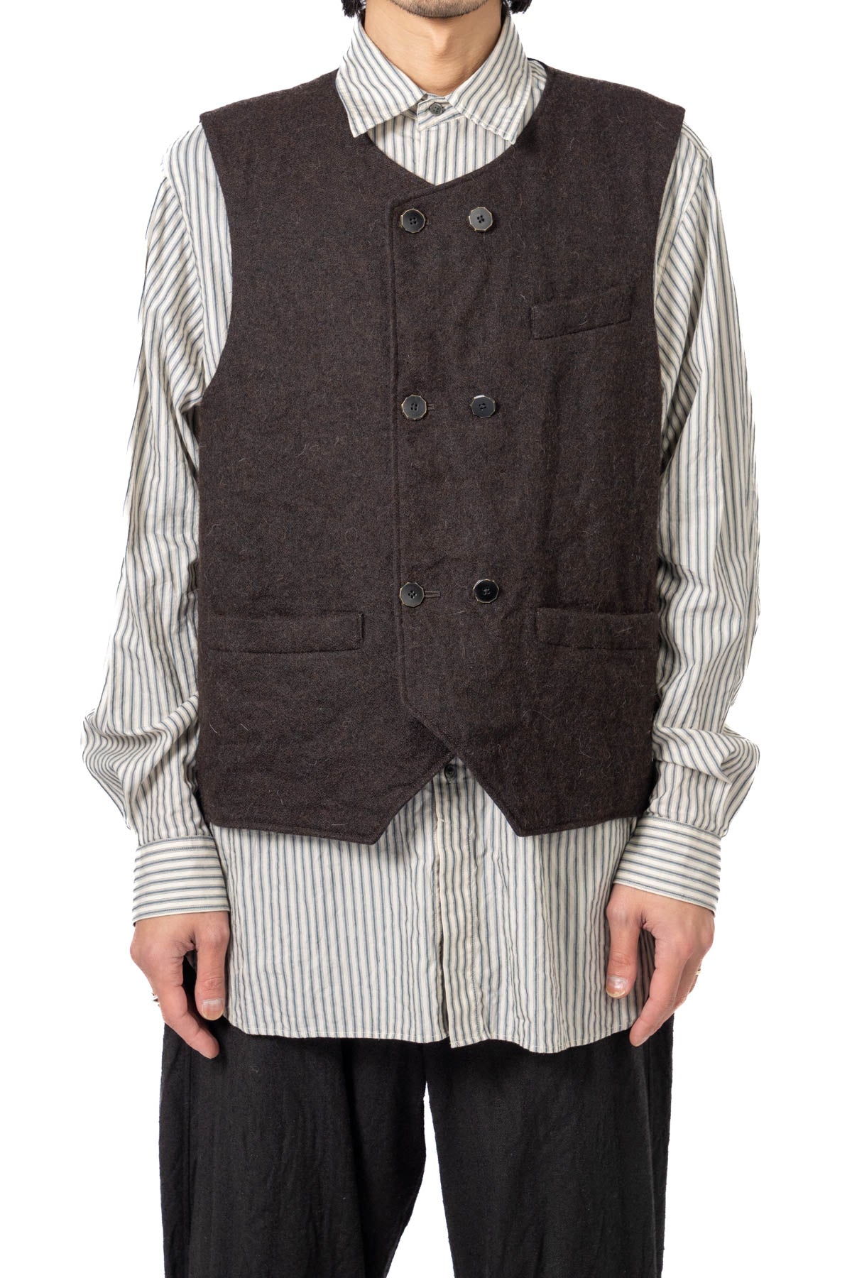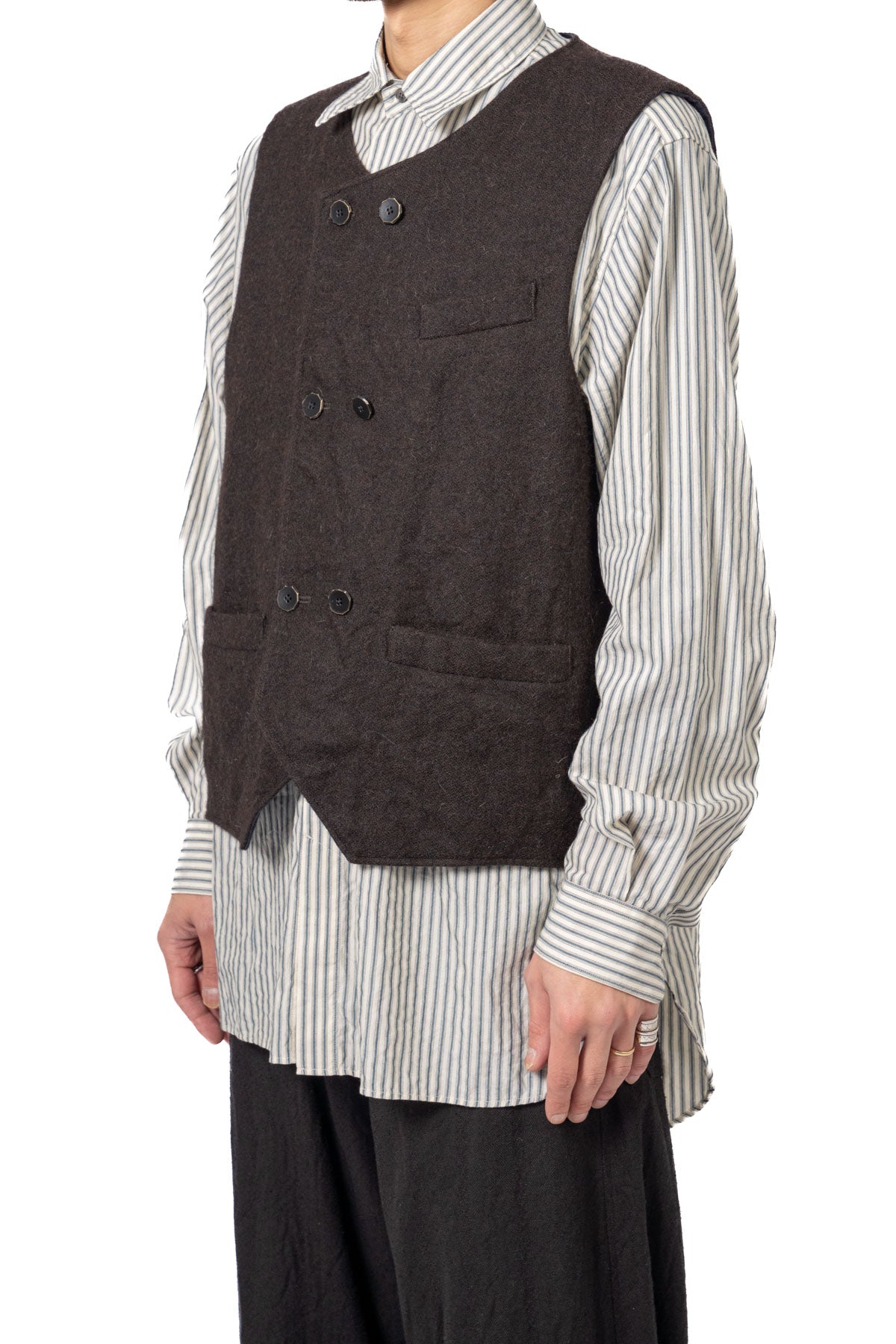 ARAKIYUUのワークベストです。まず、このベスト最大特徴はリバーシブル仕様だということ。表面ではオーセンティックなダブルブレストのウエストコートの雰囲気、もう一方の面ではディテールを変えることでワークな雰囲気に。ARAKIYUUらしい機能性とデザインを兼ね揃えた1着に仕上げています。表地の素材は遠州の機屋に眠っていたデッドストックの超高密度のコットン生地で、ミリタリーのヘリンボーンツイルのような質感の素材です。そして、裏返すとブラウンカラーのフランネル生地。アルパカ糸を使用し、二重織の組織で織り上げ、ゆっくりと時間をかけて縮絨させた素材です。ブランドのアイコンである真鍮ボタンはハンドで叩きを入れブラックコーティングを施しています。このコーティングが使用感によって剥げてきたときのブラックの生地とゴールドのボタンがコントラストを生みます。
