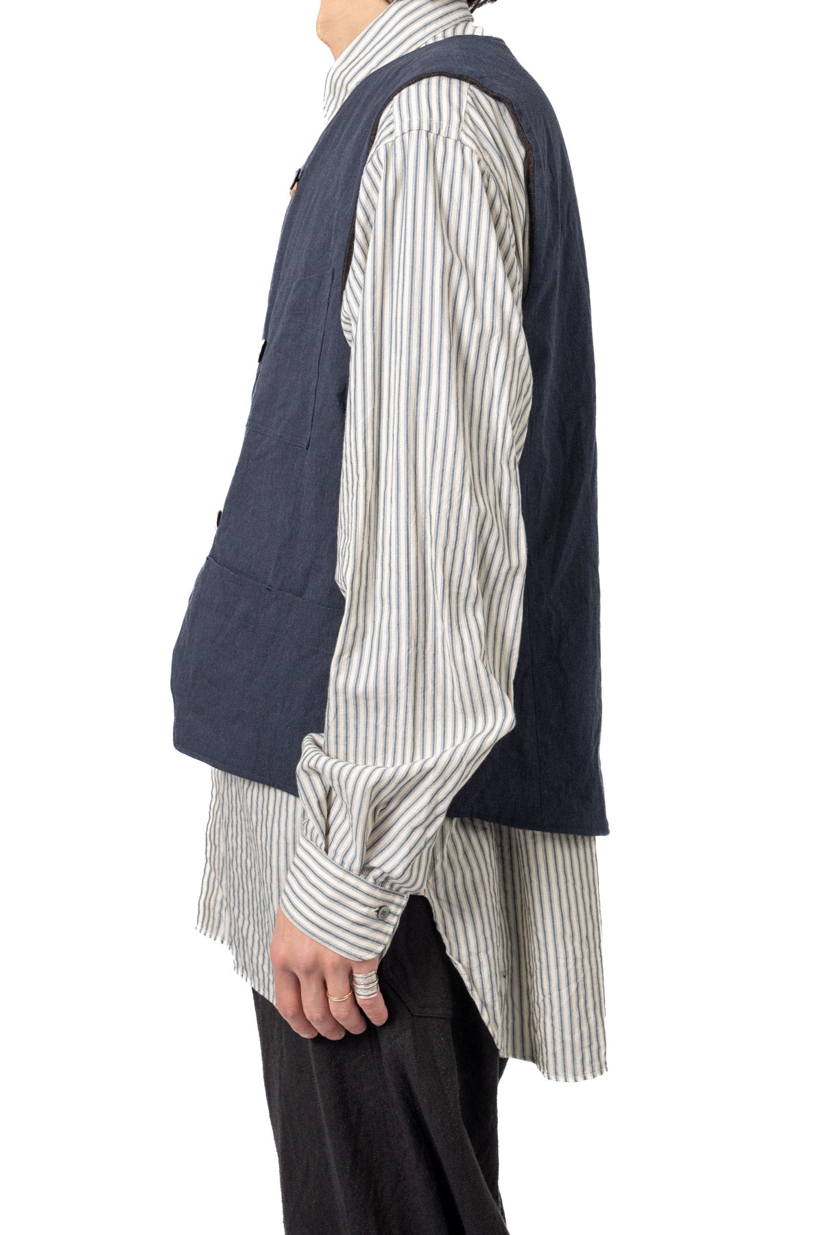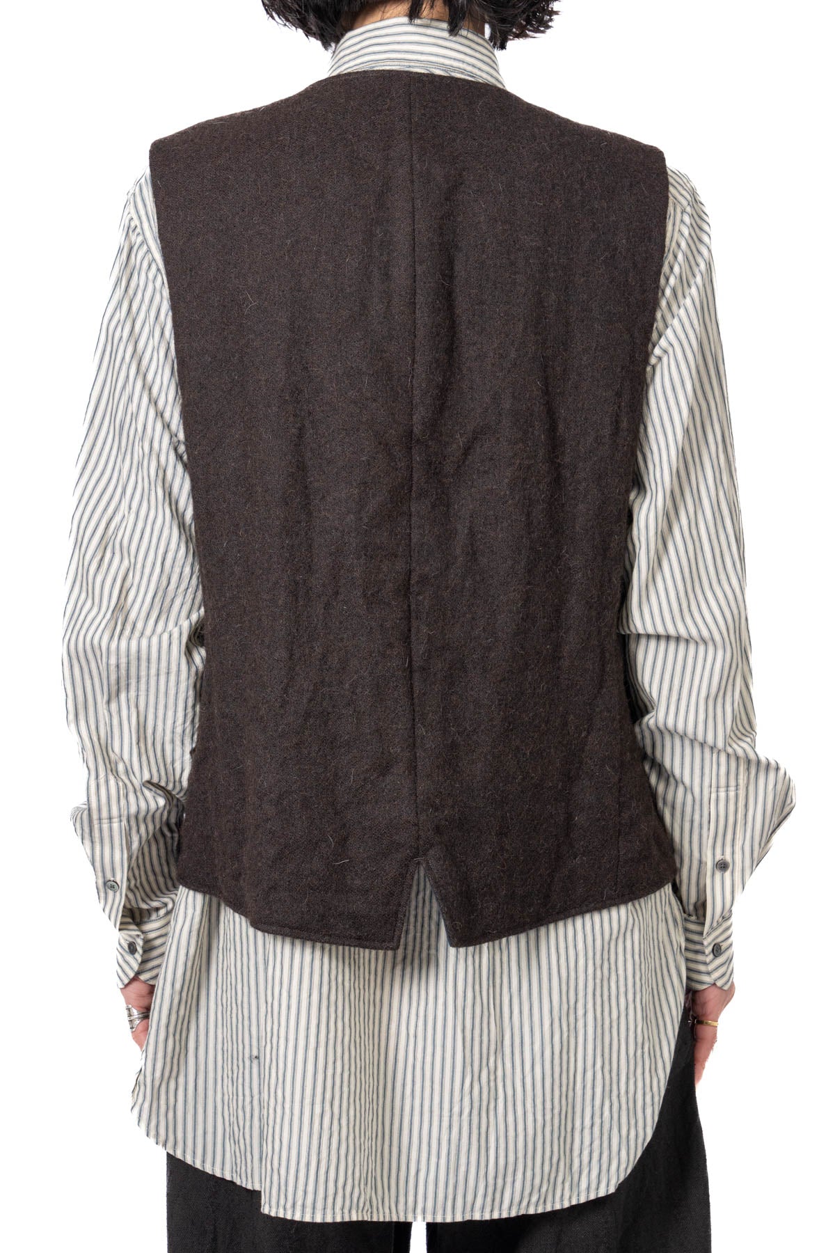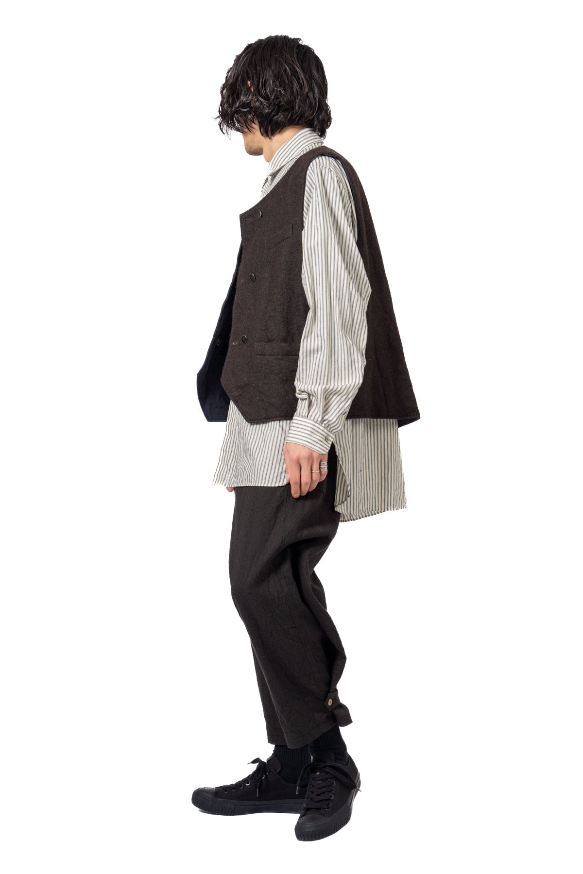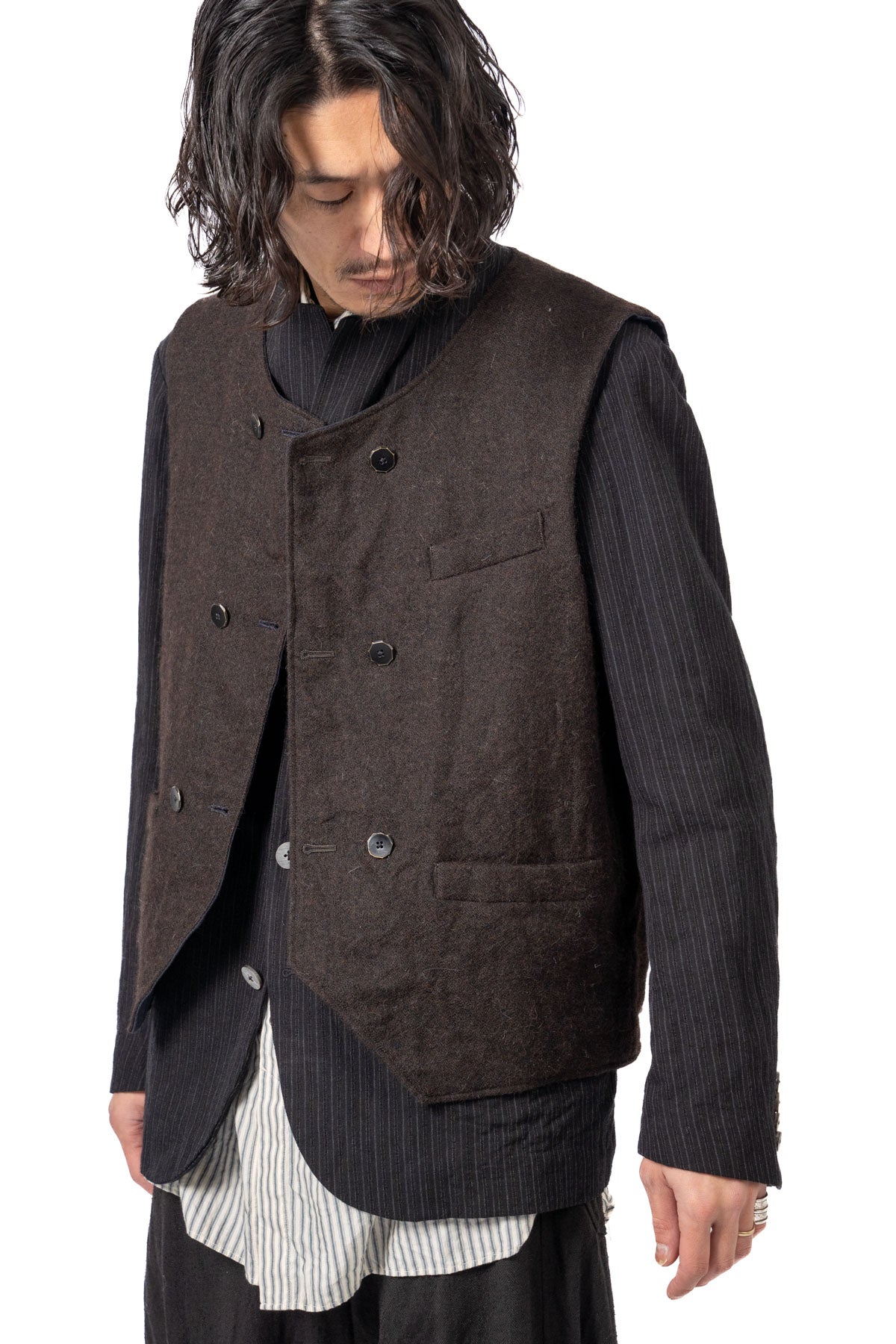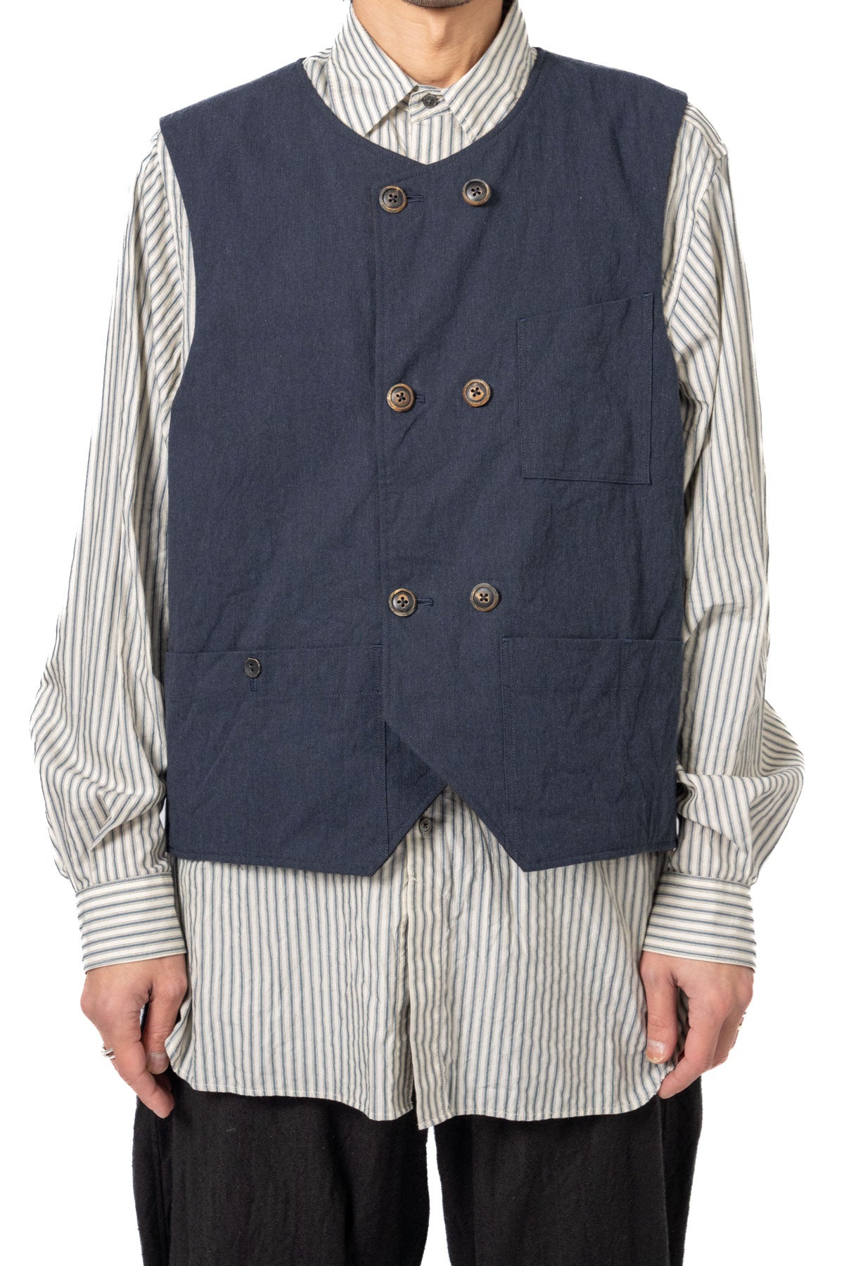 ARAKIYUUのワークベストです。まず、このベスト最大特徴はリバーシブル仕様だということ。表面ではオーセンティックなダブルブレストのウエストコートの雰囲気、もう一方の面ではディテールを変えることでワークな雰囲気に。ARAKIYUUらしい機能性とデザインを兼ね揃えた1着に仕上げています。表地の素材は遠州の機屋に眠っていたデッドストックの超高密度のコットン生地で、ミリタリーのヘリンボーンツイルのような質感の素材です。そして、裏返すとブラウンカラーのフランネル生地。アルパカ糸を使用し、二重織の組織で織り上げ、ゆっくりと時間をかけて縮絨させた素材です。ブランドのアイコンである真鍮ボタンはハンドで叩きを入れブラックコーティングを施しています。このコーティングが使用感によって剥げてきたときのブラックの生地とゴールドのボタンがコントラストを生みます。