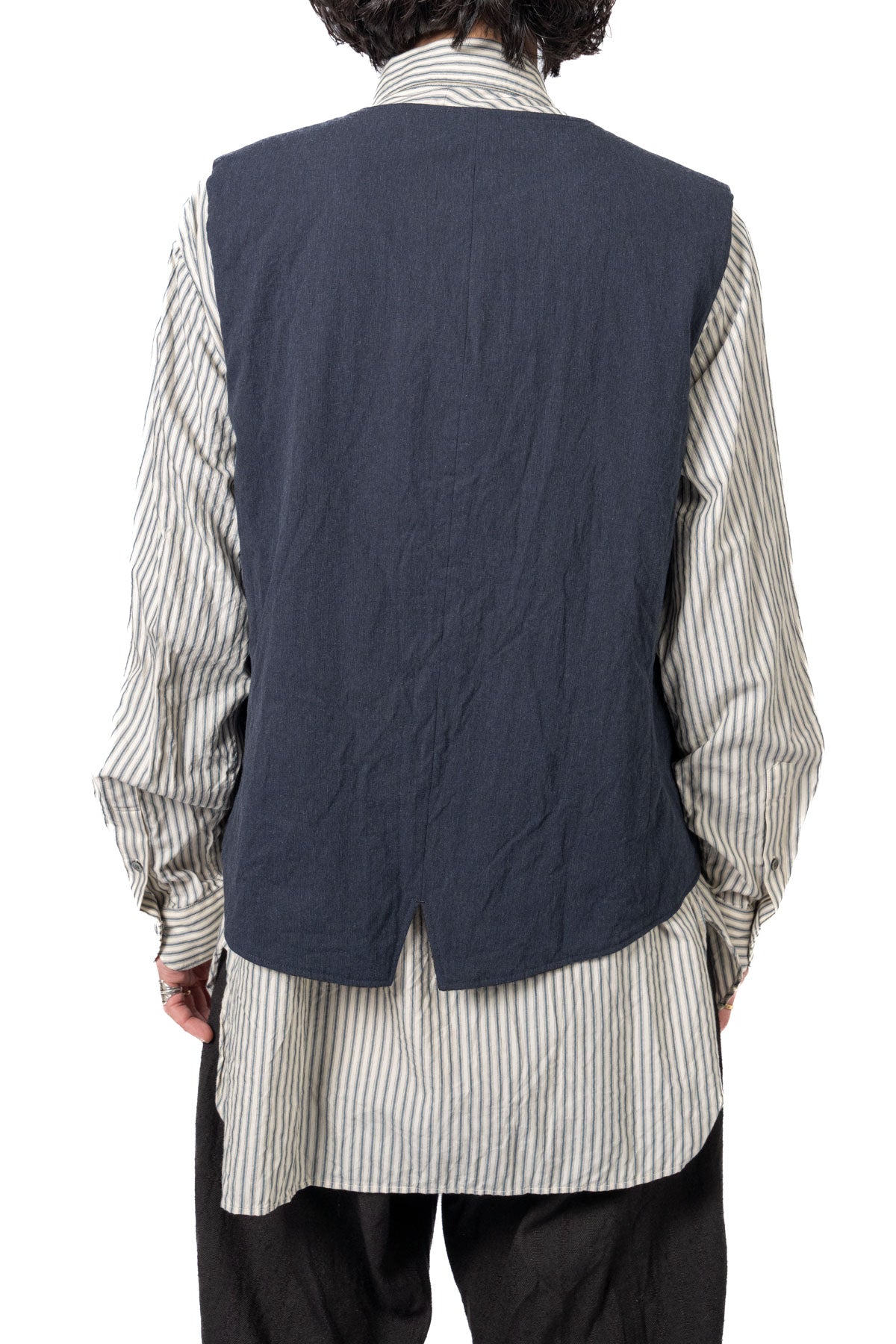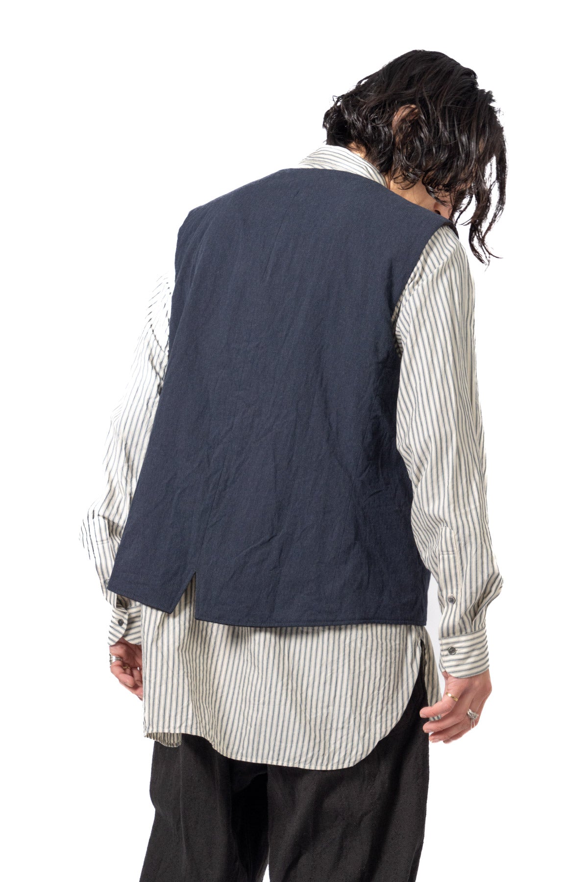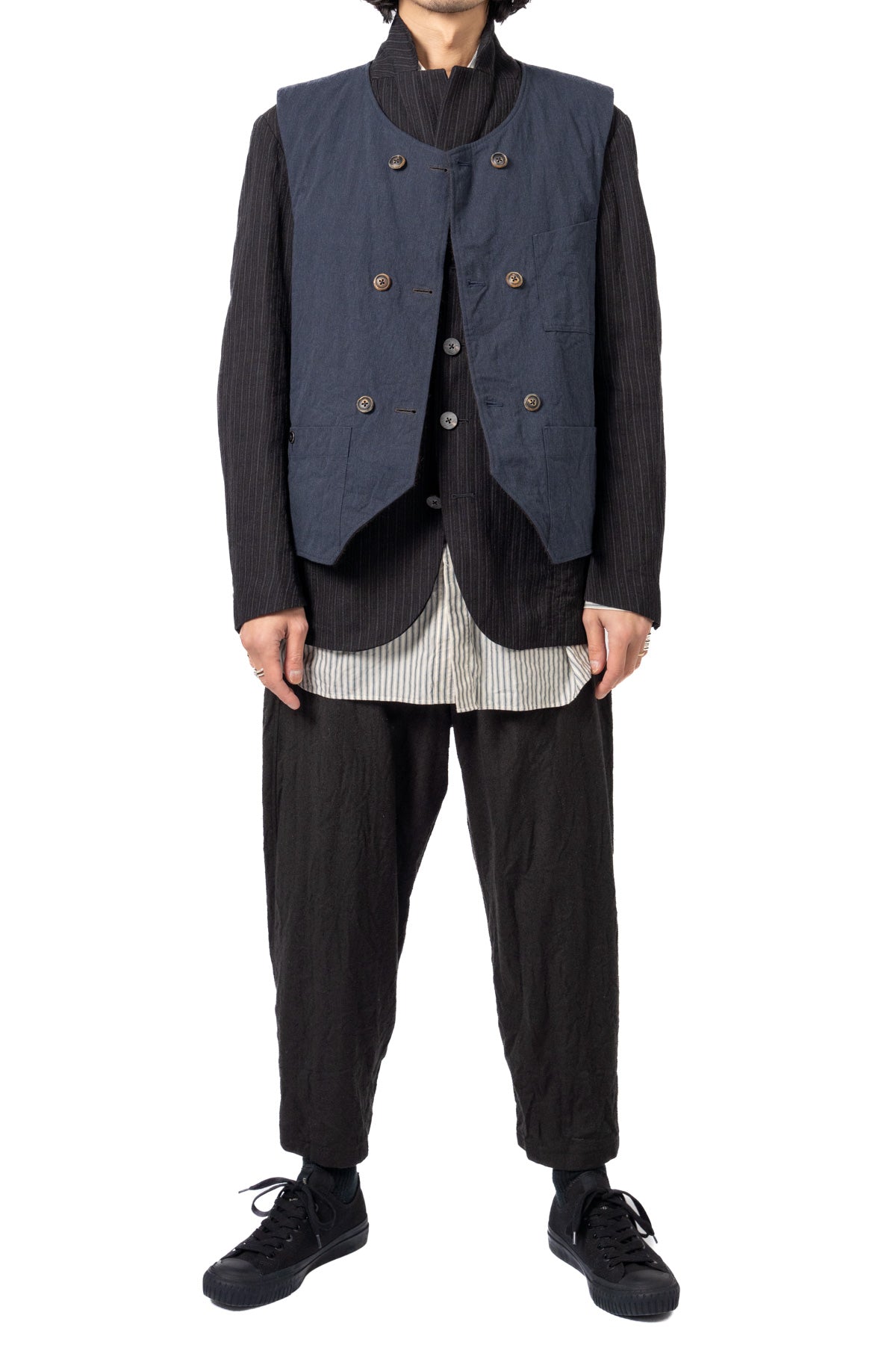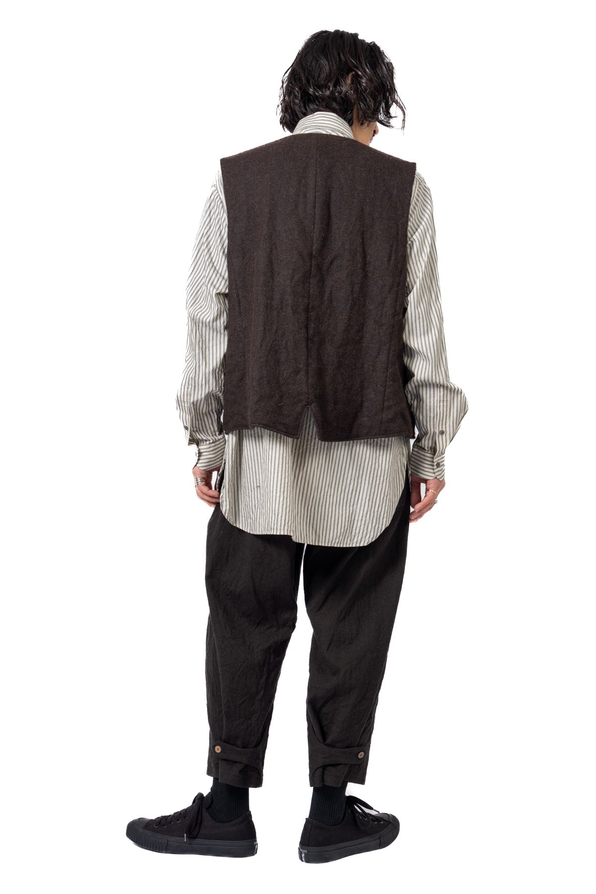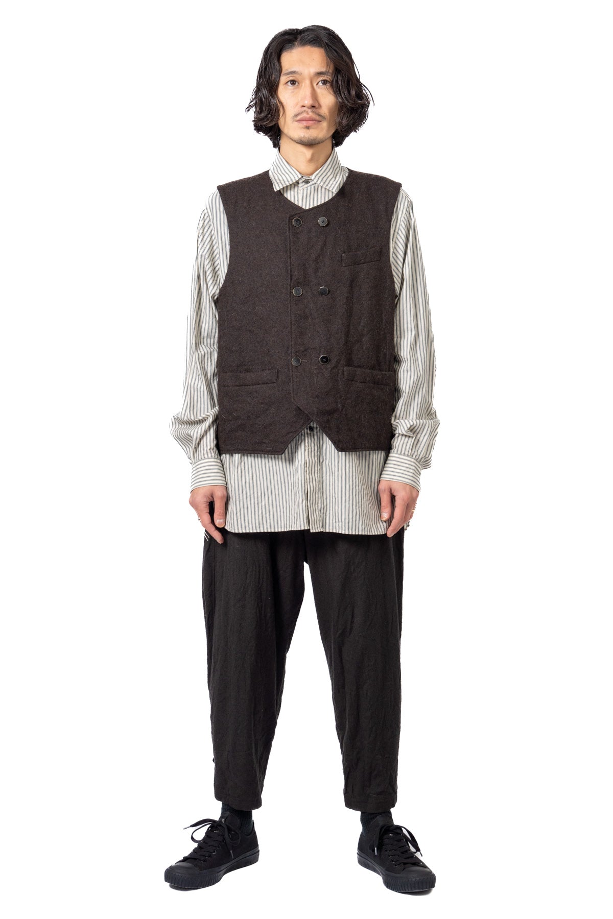 ARAKIYUUのワークベストです。まず、このベスト最大特徴はリバーシブル仕様だということ。表面ではオーセンティックなダブルブレストのウエストコートの雰囲気、もう一方の面ではディテールを変えることでワークな雰囲気に。ARAKIYUUらしい機能性とデザインを兼ね揃えた1着に仕上げています。表地の素材は遠州の機屋に眠っていたデッドストックの超高密度のコットン生地で、ミリタリーのヘリンボーンツイルのような質感の素材です。そして、裏返すとブラウンカラーのフランネル生地。アルパカ糸を使用し、二重織の組織で織り上げ、ゆっくりと時間をかけて縮絨させた素材です。ブランドのアイコンである真鍮ボタンはハンドで叩きを入れブラックコーティングを施しています。このコーティングが使用感によって剥げてきたときのブラックの生地とゴールドのボタンがコントラストを生みます。