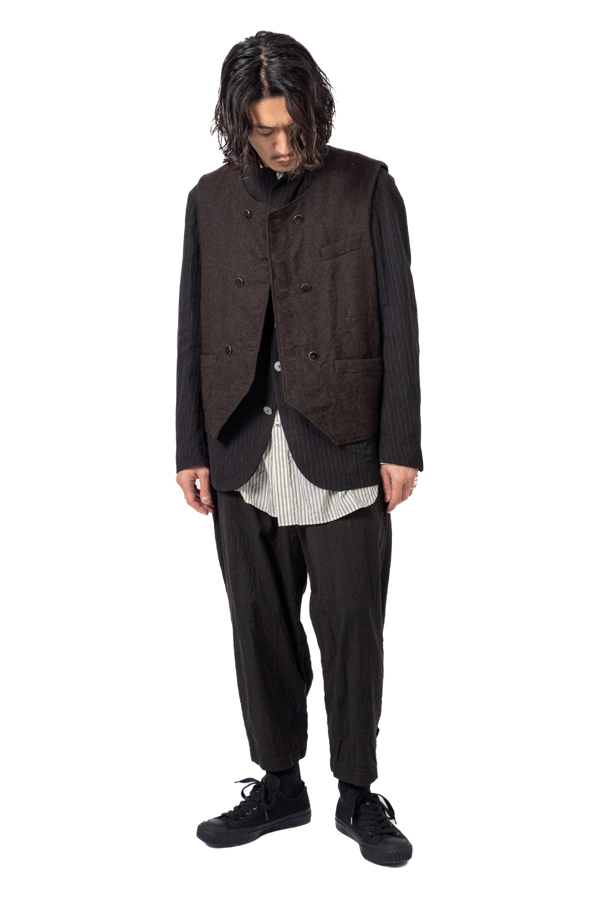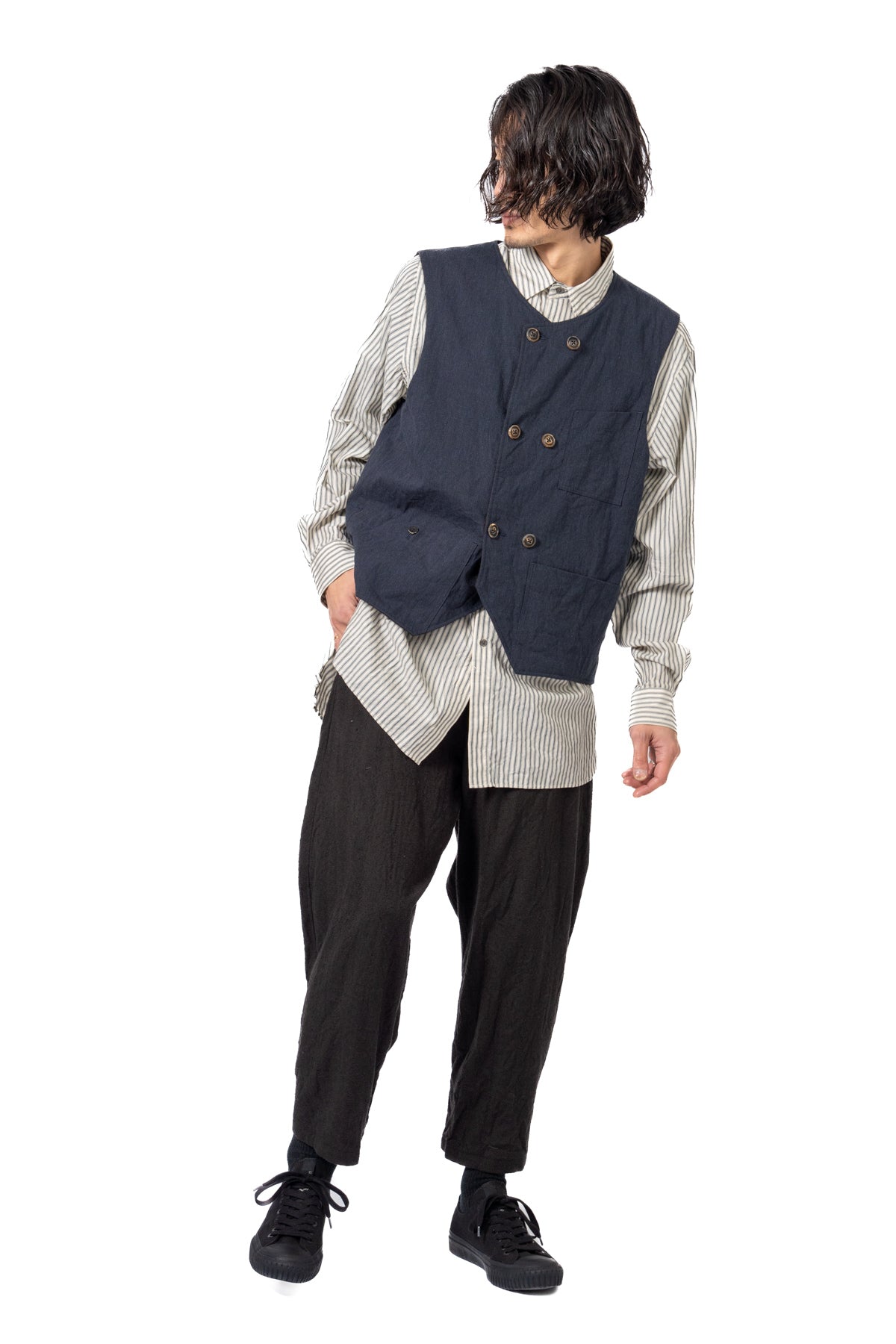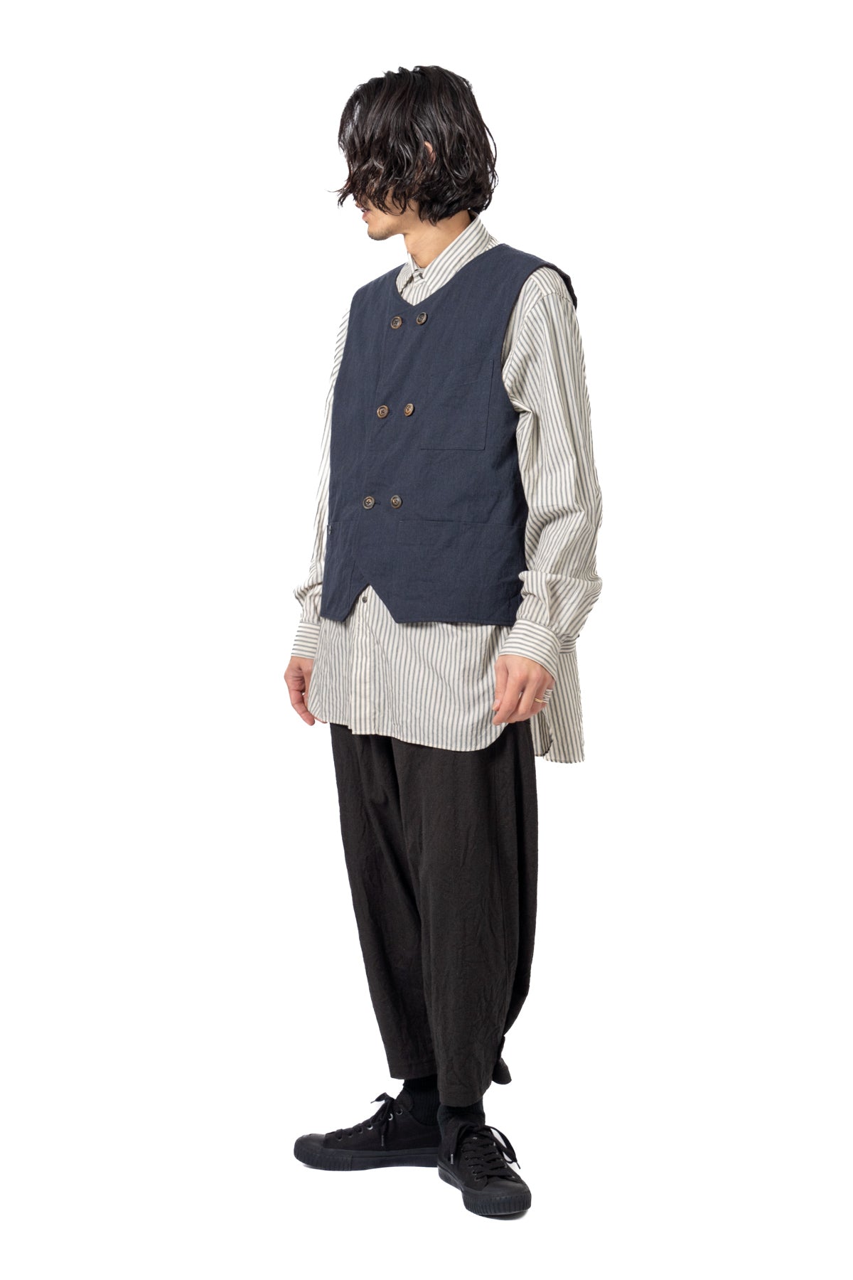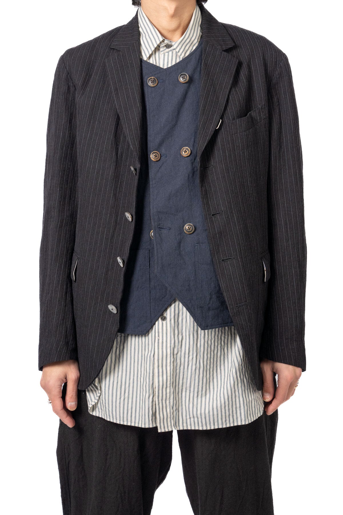 ARAKIYUUのワークベストです。まず、このベスト最大特徴はリバーシブル仕様だということ。表面ではオーセンティックなダブルブレストのウエストコートの雰囲気、もう一方の面ではディテールを変えることでワークな雰囲気に。ARAKIYUUらしい機能性とデザインを兼ね揃えた1着に仕上げています。表地の素材は遠州の機屋に眠っていたデッドストックの超高密度のコットン生地で、ミリタリーのヘリンボーンツイルのような質感の素材です。そして、裏返すとブラウンカラーのフランネル生地。アルパカ糸を使用し、二重織の組織で織り上げ、ゆっくりと時間をかけて縮絨させた素材です。ブランドのアイコンである真鍮ボタンはハンドで叩きを入れブラックコーティングを施しています。このコーティングが使用感によって剥げてきたときのブラックの生地とゴールドのボタンがコントラストを生みます。