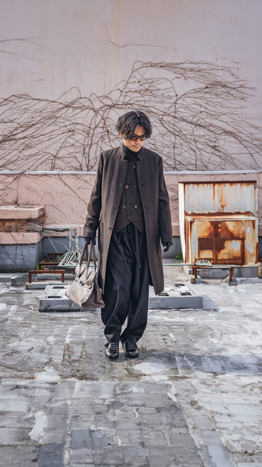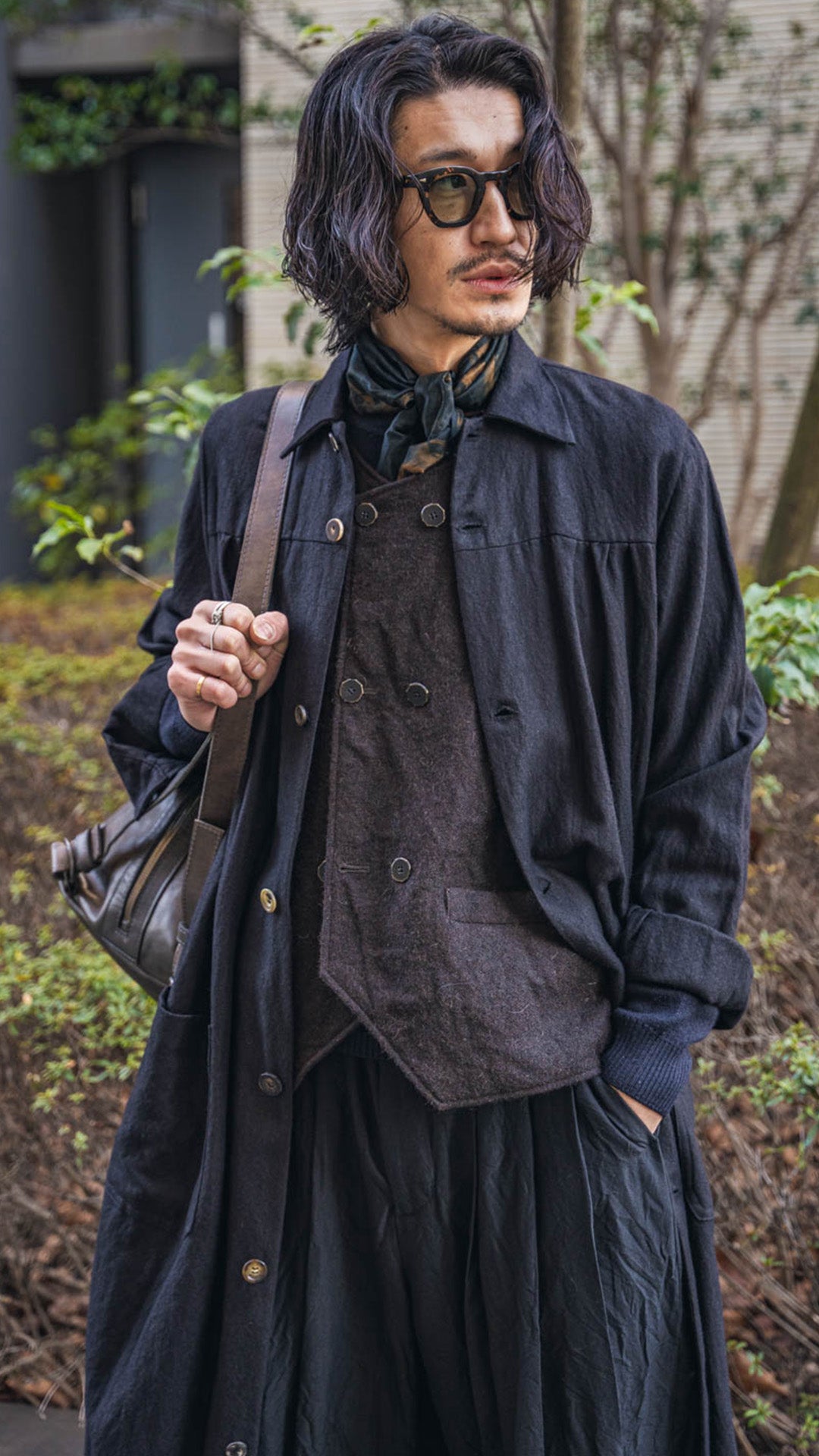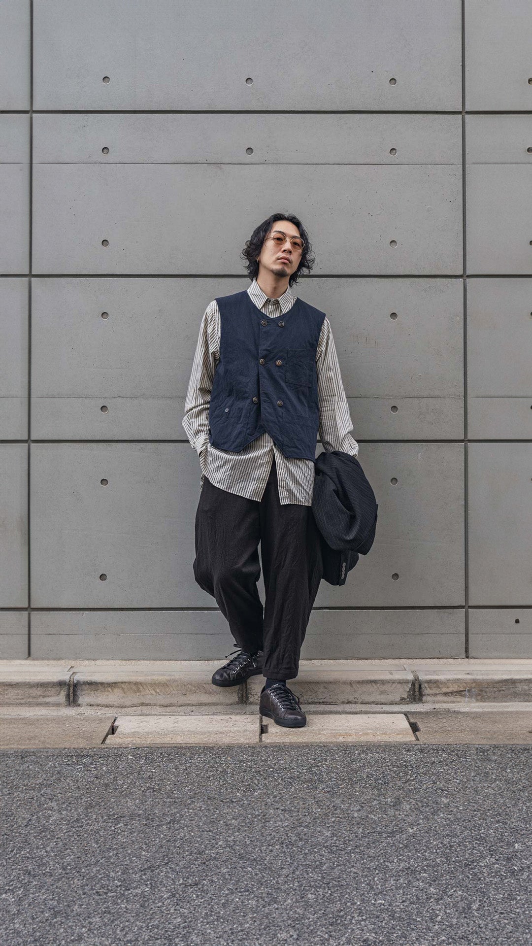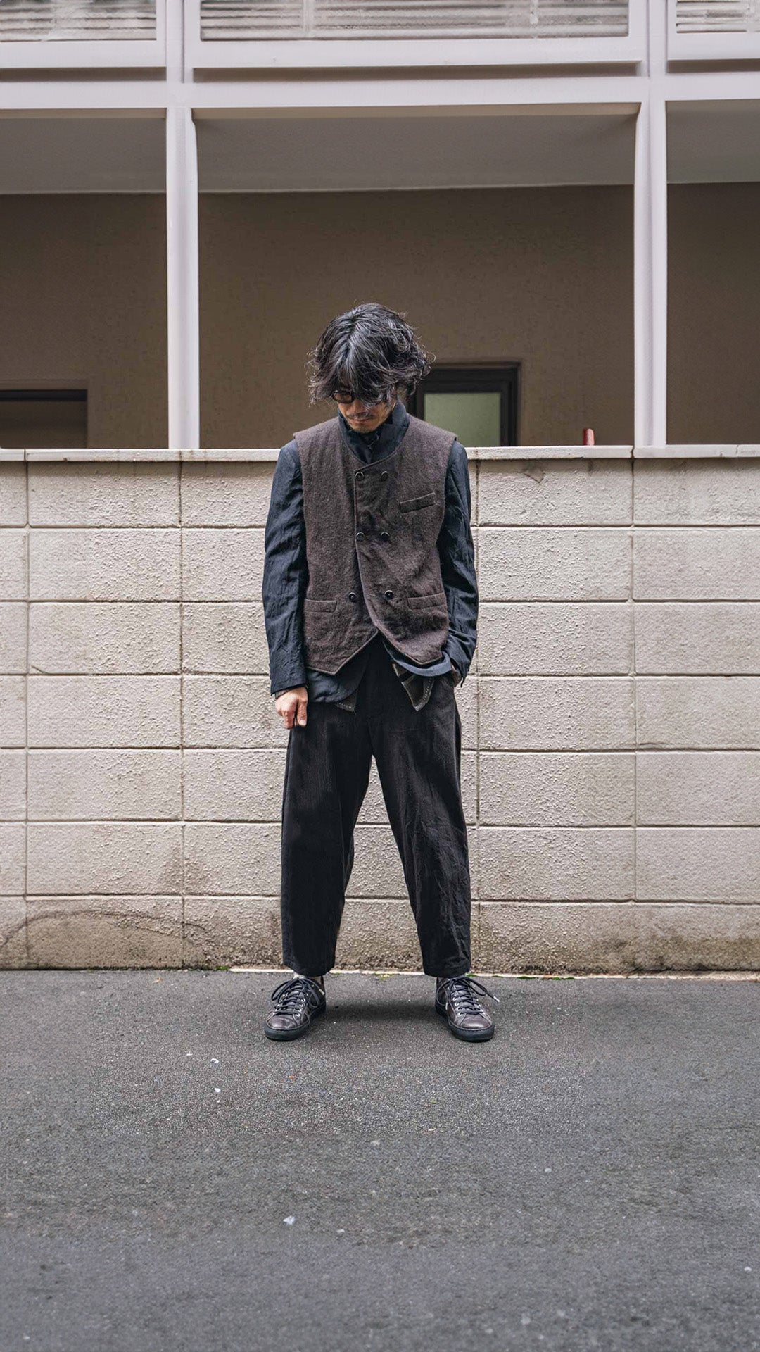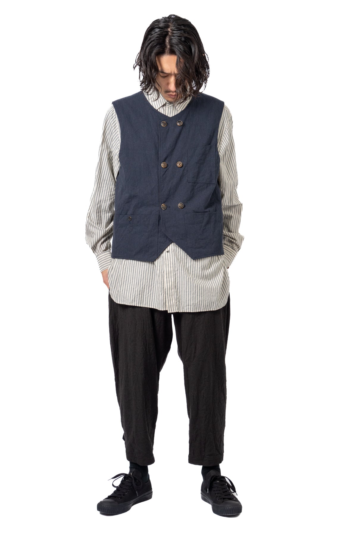 ARAKIYUUのワークベストです。まず、このベスト最大特徴はリバーシブル仕様だということ。表面ではオーセンティックなダブルブレストのウエストコートの雰囲気、もう一方の面ではディテールを変えることでワークな雰囲気に。ARAKIYUUらしい機能性とデザインを兼ね揃えた1着に仕上げています。表地の素材は遠州の機屋に眠っていたデッドストックの超高密度のコットン生地で、ミリタリーのヘリンボーンツイルのような質感の素材です。そして、裏返すとブラウンカラーのフランネル生地。アルパカ糸を使用し、二重織の組織で織り上げ、ゆっくりと時間をかけて縮絨させた素材です。ブランドのアイコンである真鍮ボタンはハンドで叩きを入れブラックコーティングを施しています。このコーティングが使用感によって剥げてきたときのブラックの生地とゴールドのボタンがコントラストを生みます。