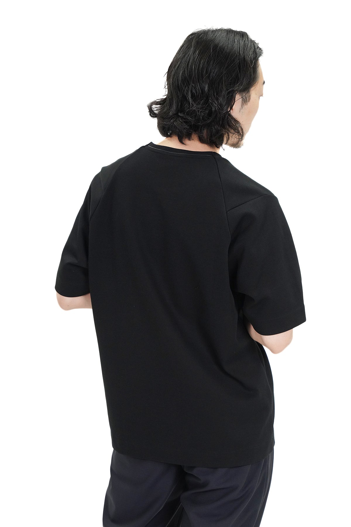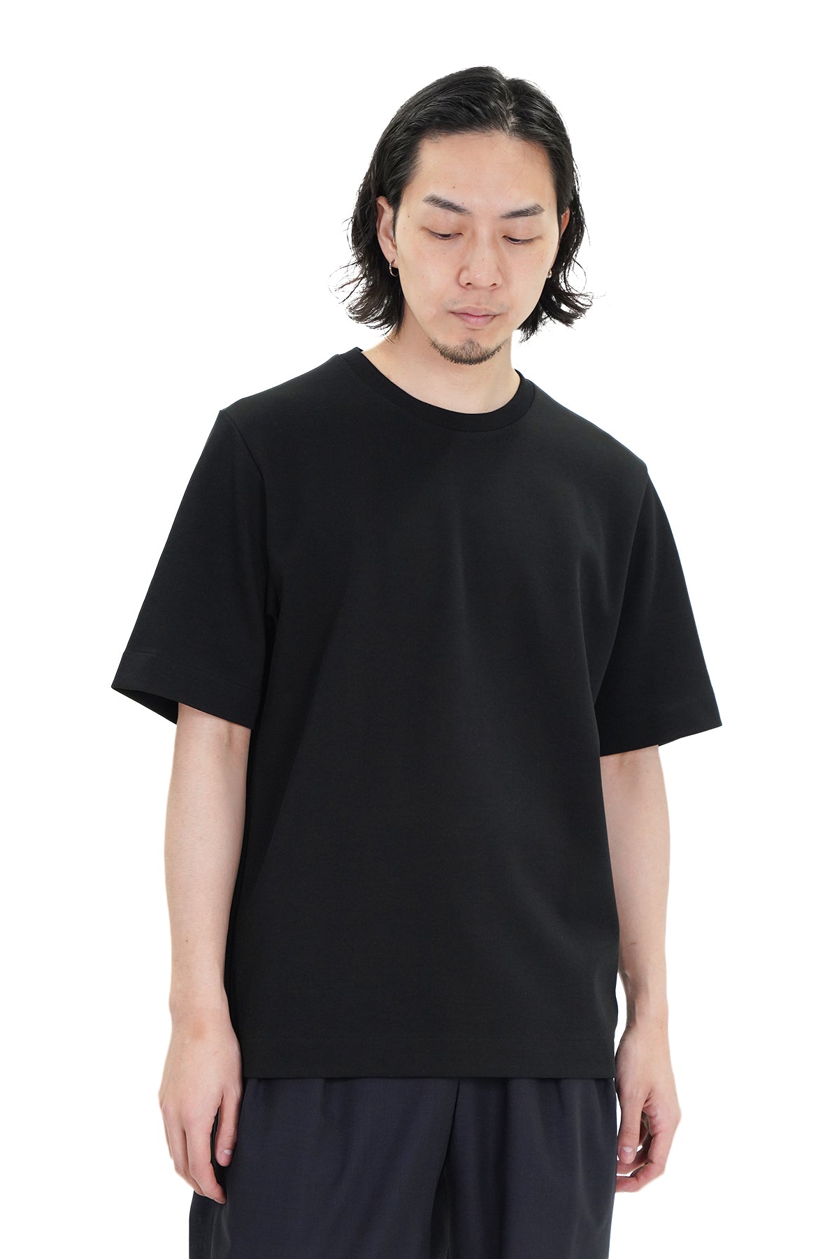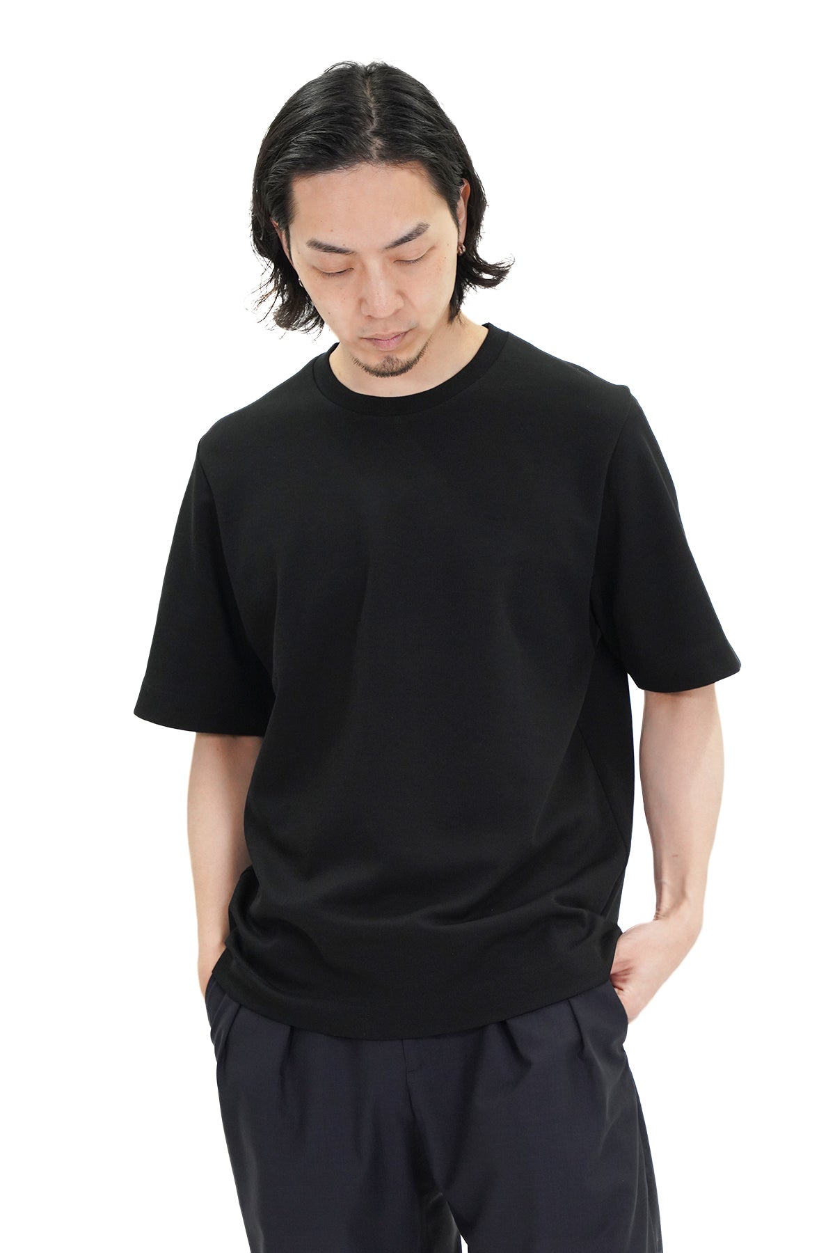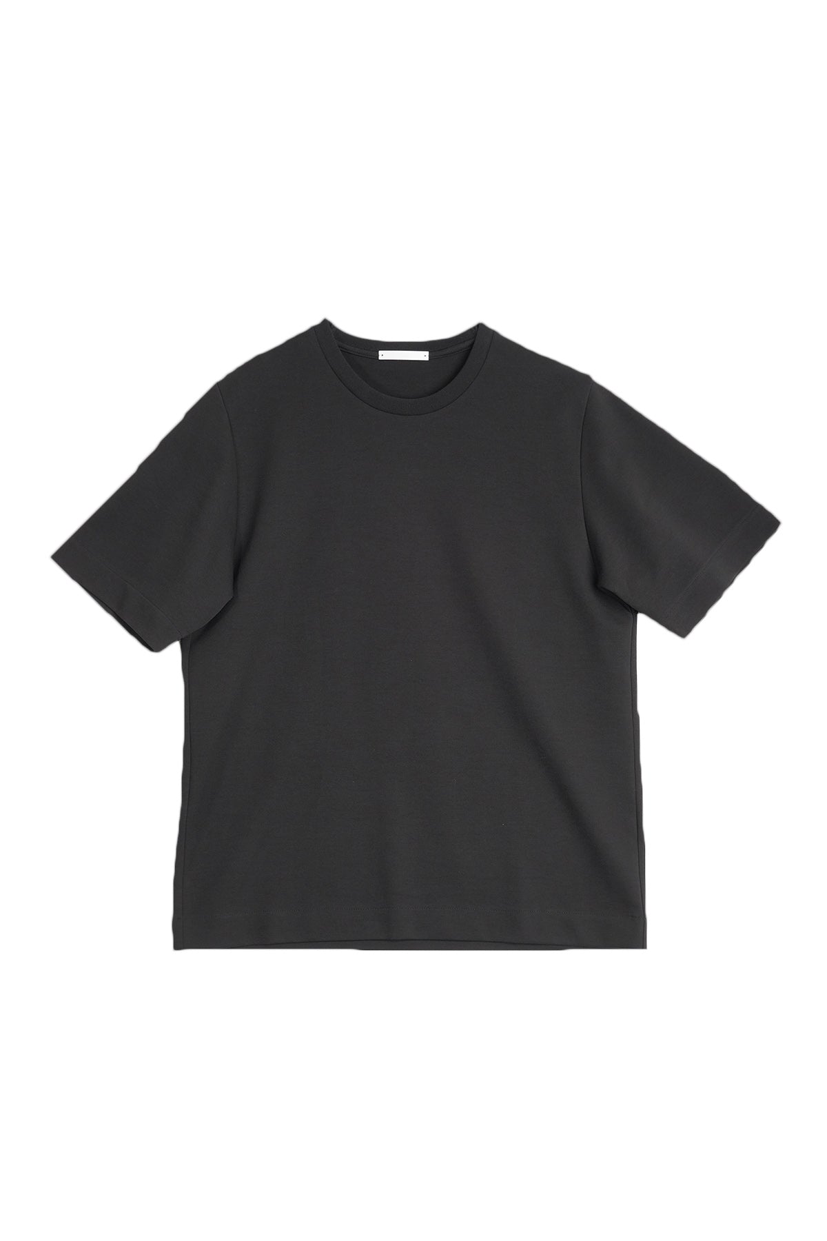 強撚の特殊2重編みのコットン素材を使用して、後衿ぐりにコードを入れた半袖Tシャツ。