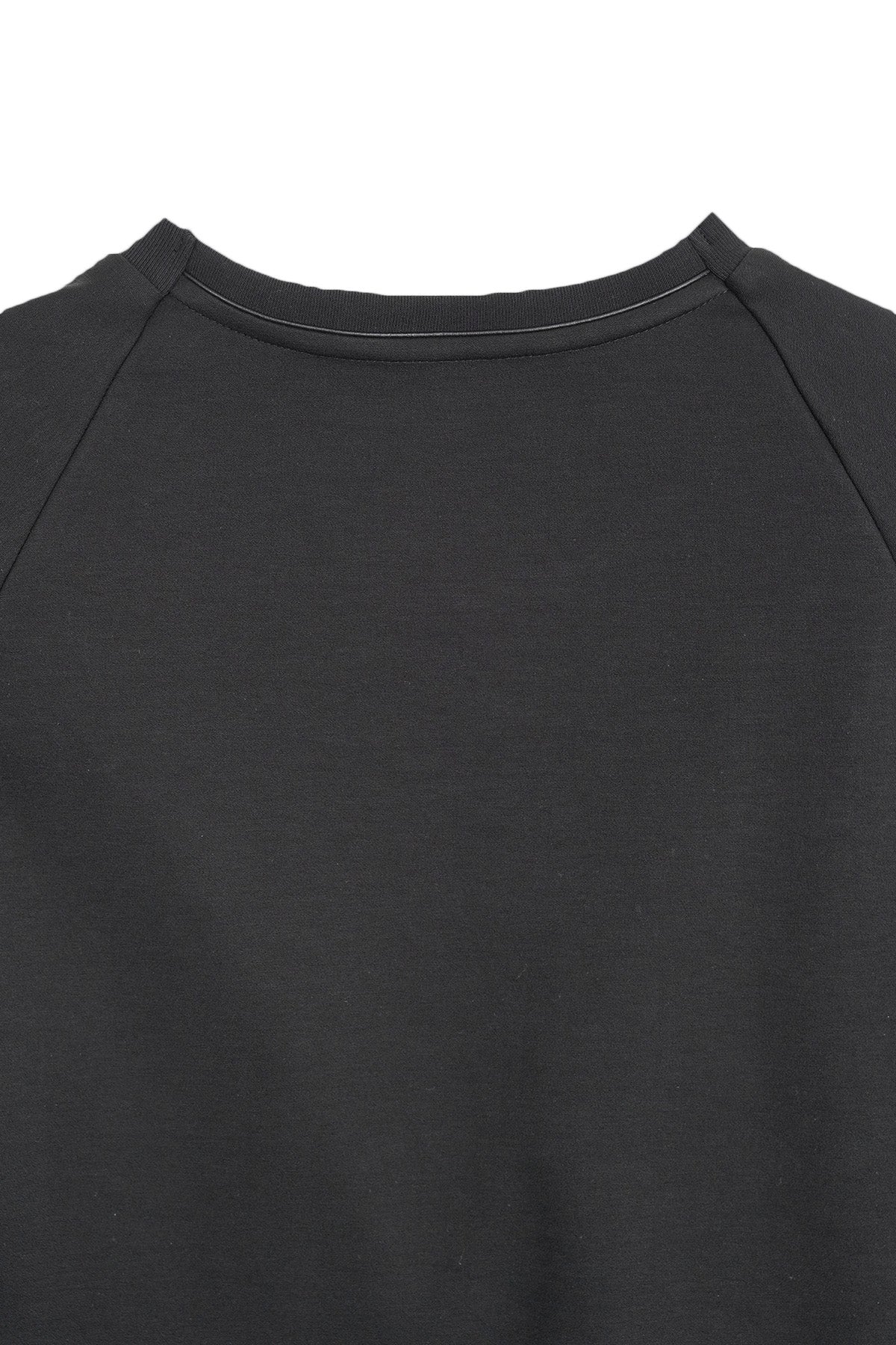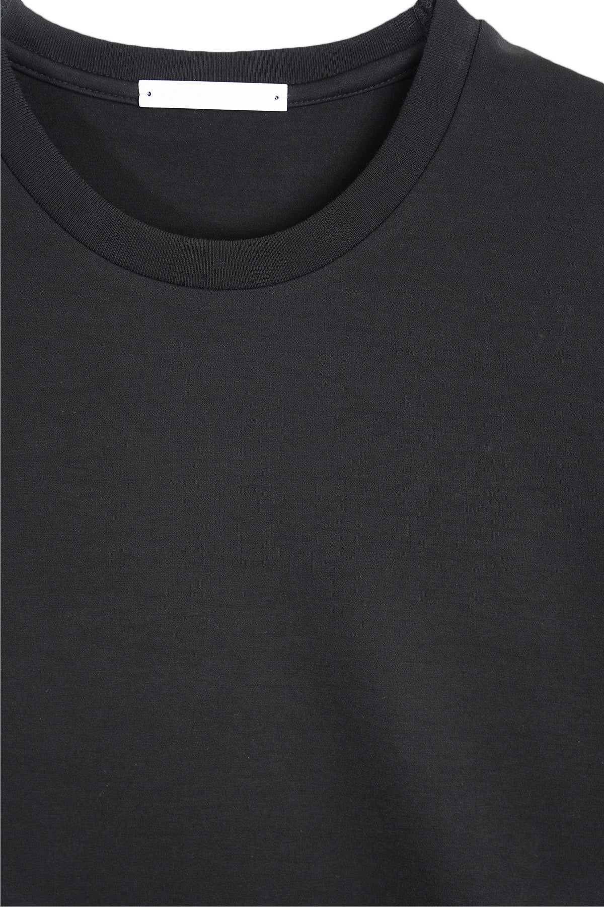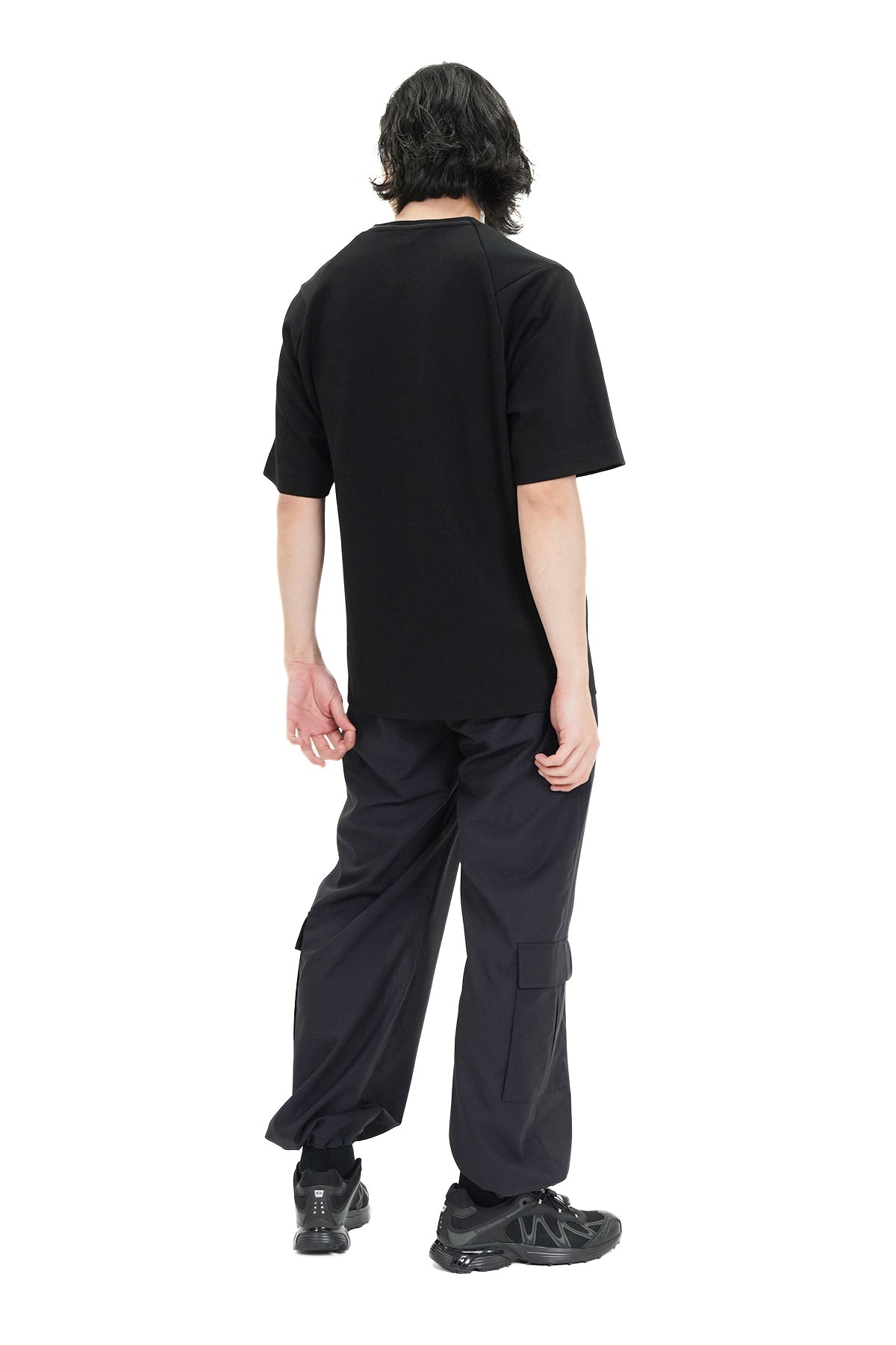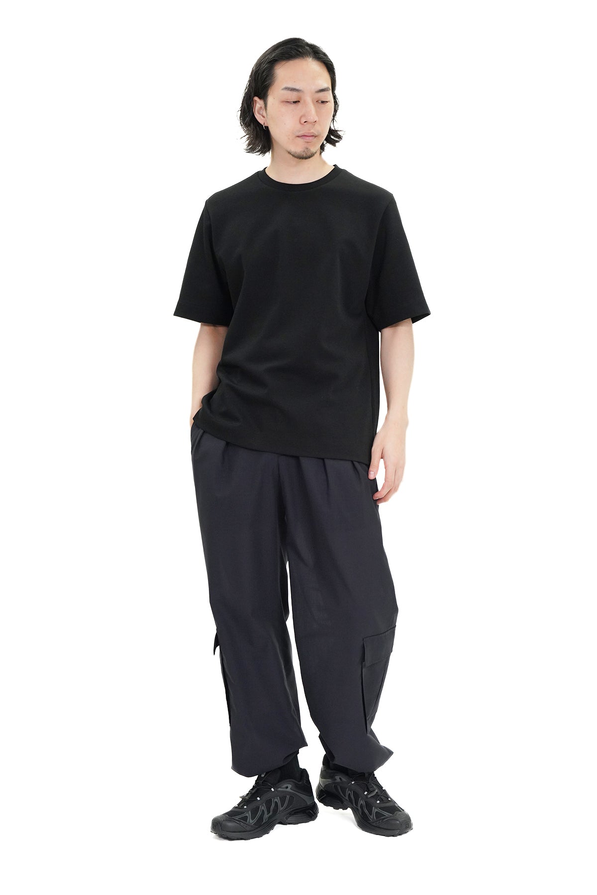 強撚の特殊2重編みのコットン素材を使用して、後衿ぐりにコードを入れた半袖Tシャツ。