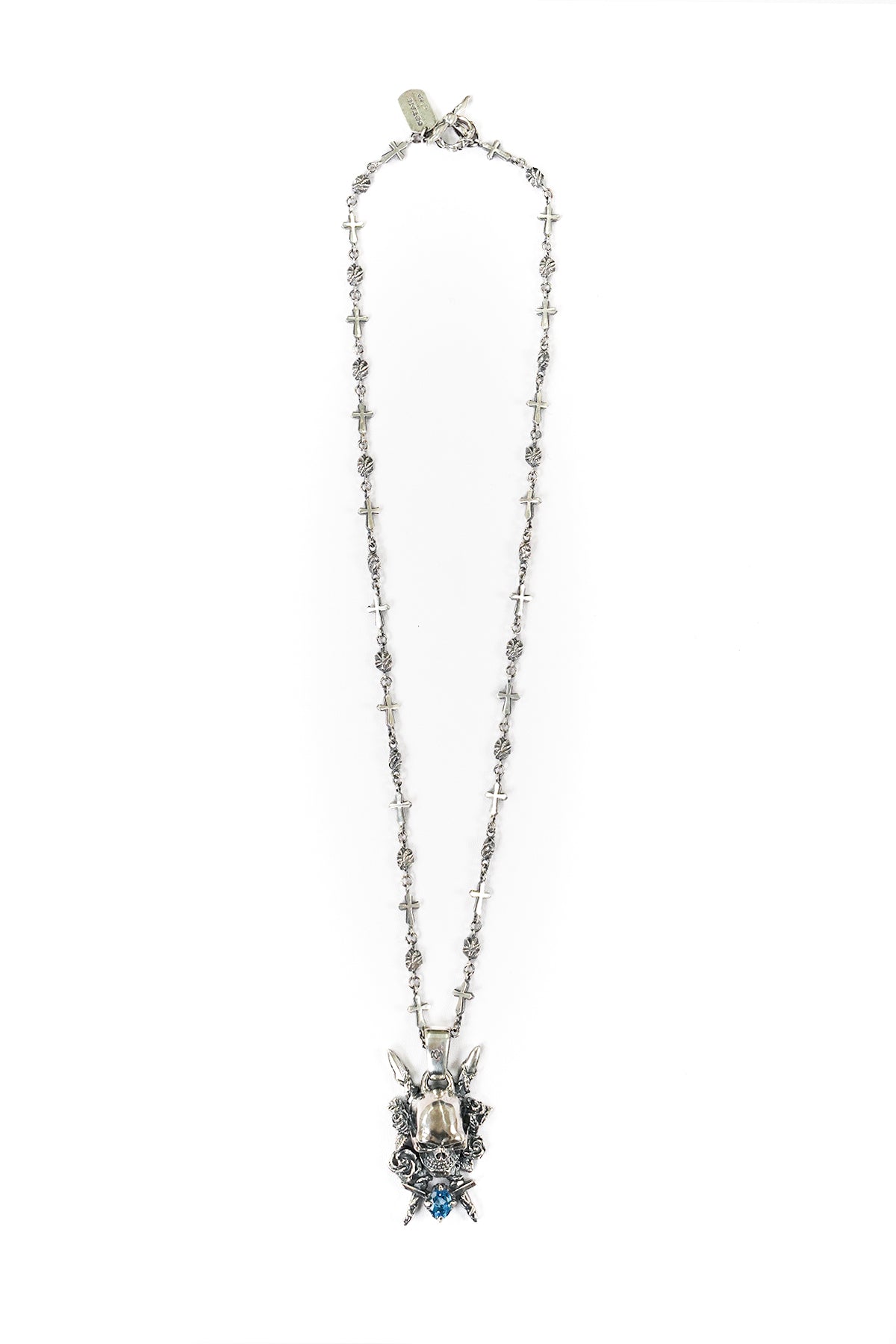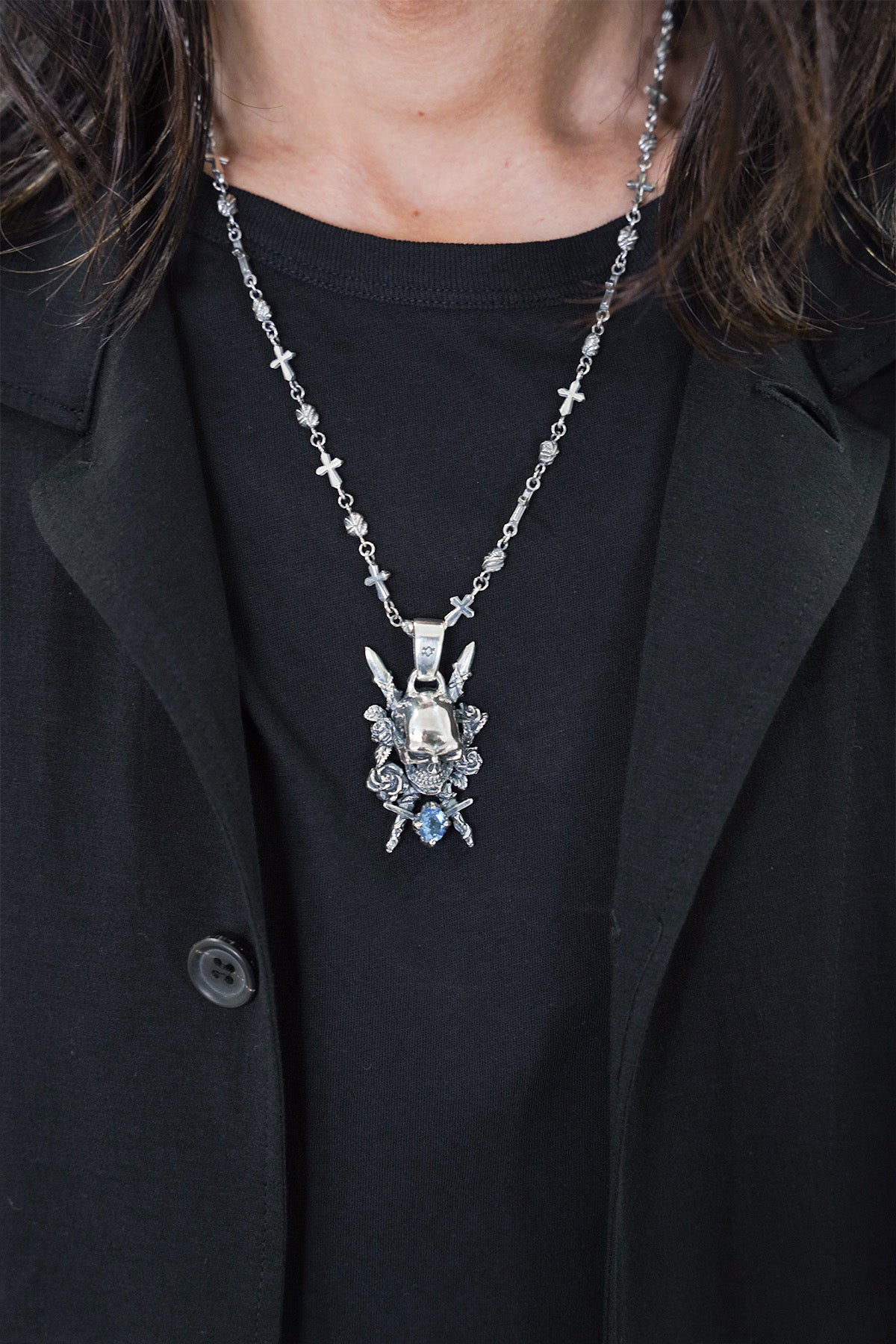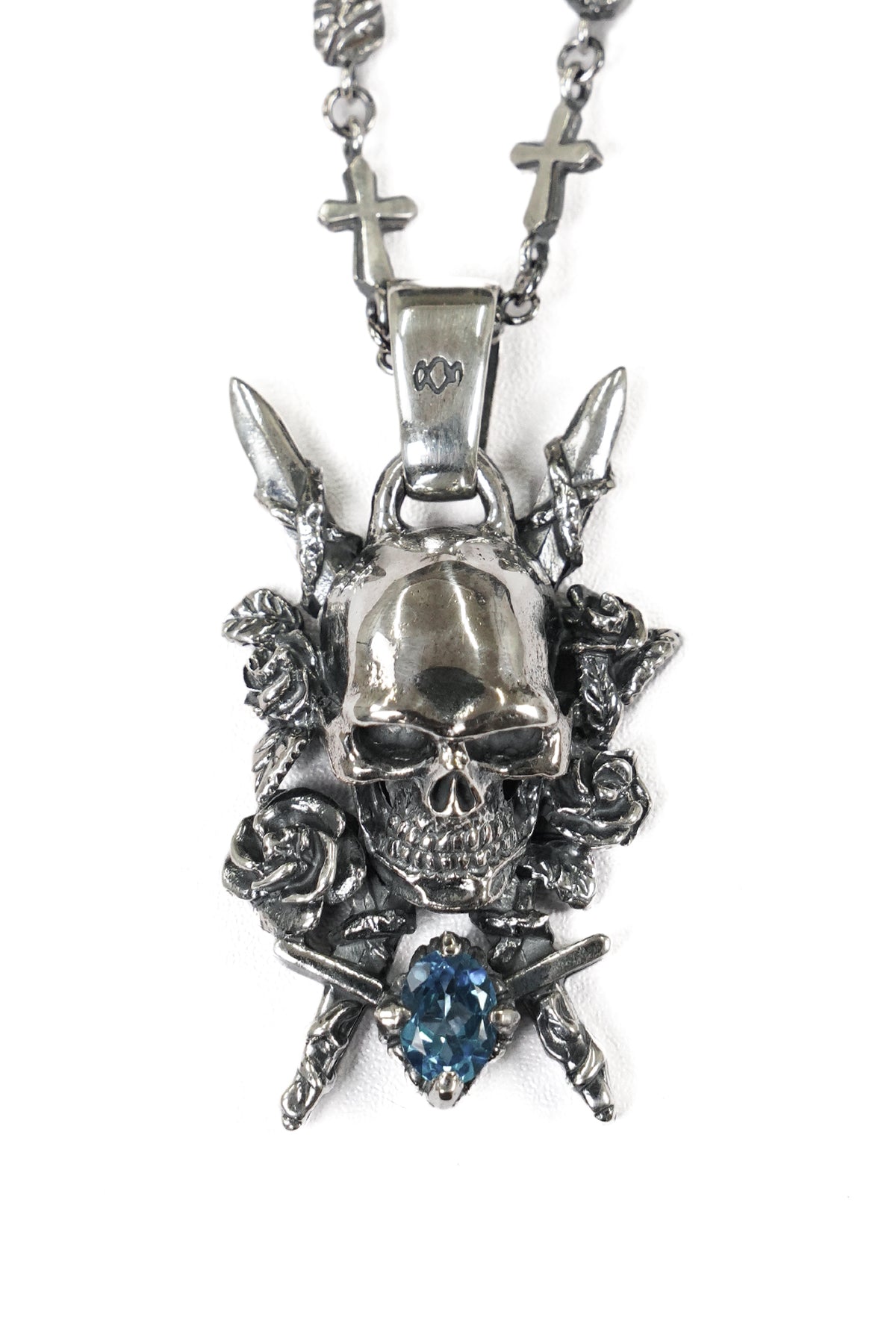 ブルートパーズを添えた薔薇、ダガー、スカルを組み合わせたペンダントヘッドとクロスチェーン。