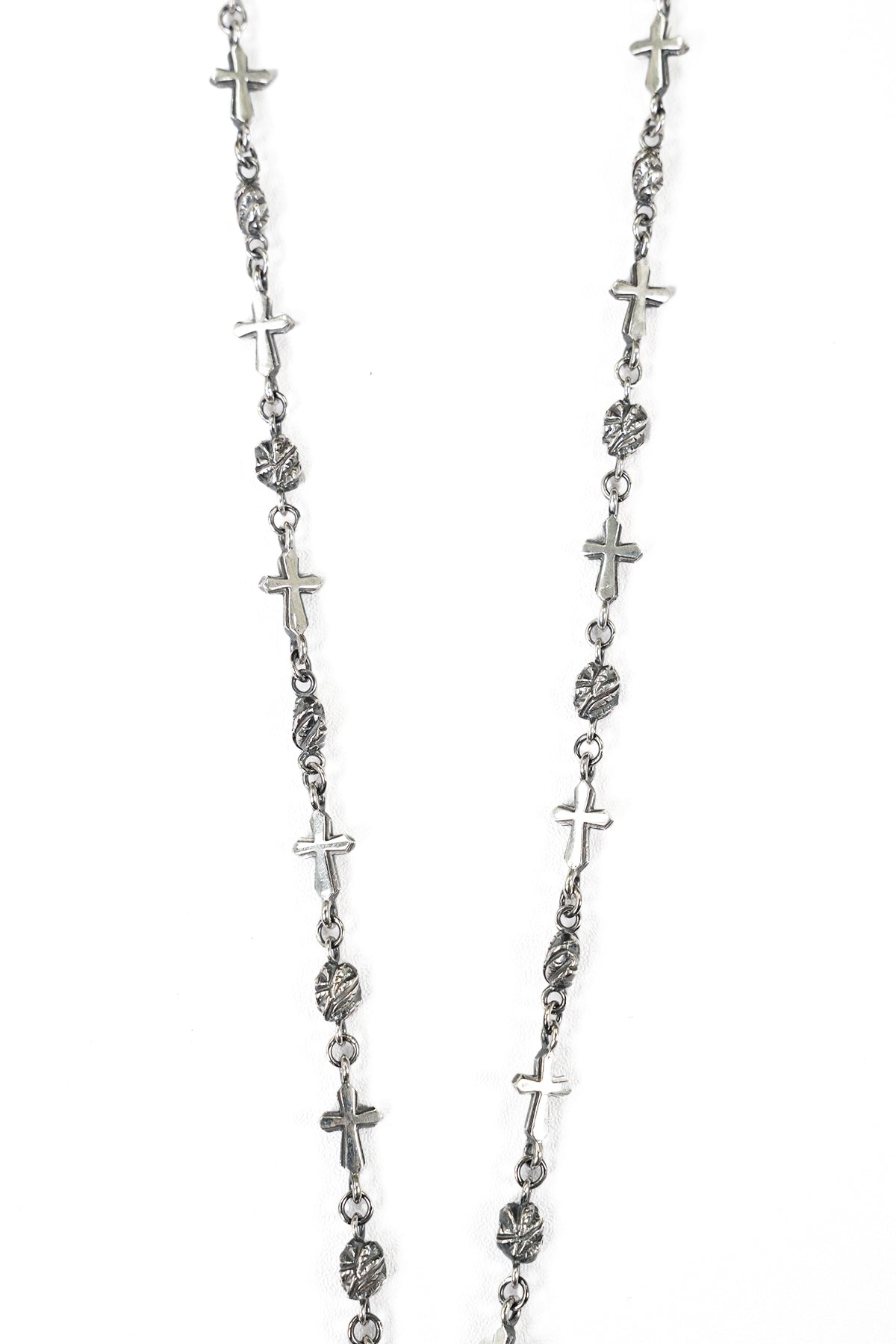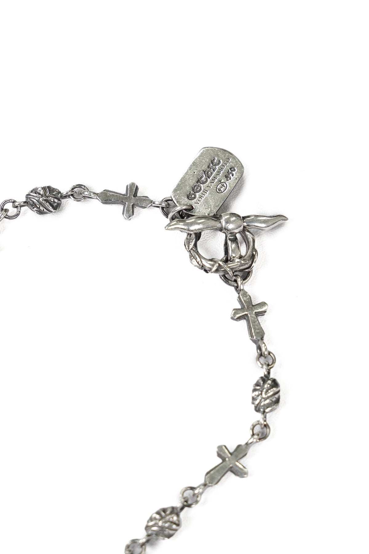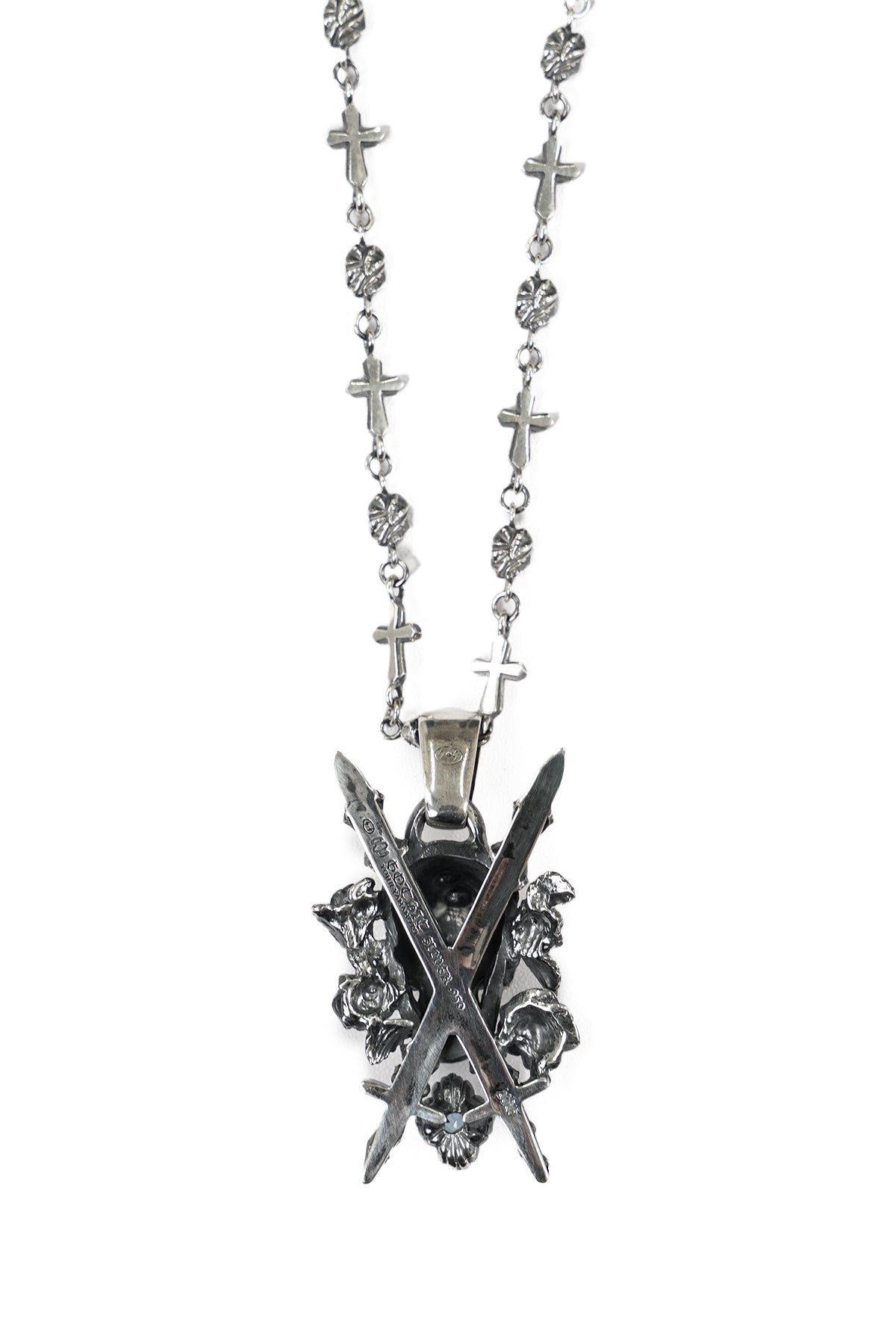 ブルートパーズを添えた薔薇、ダガー、スカルを組み合わせたペンダントヘッドとクロスチェーン。